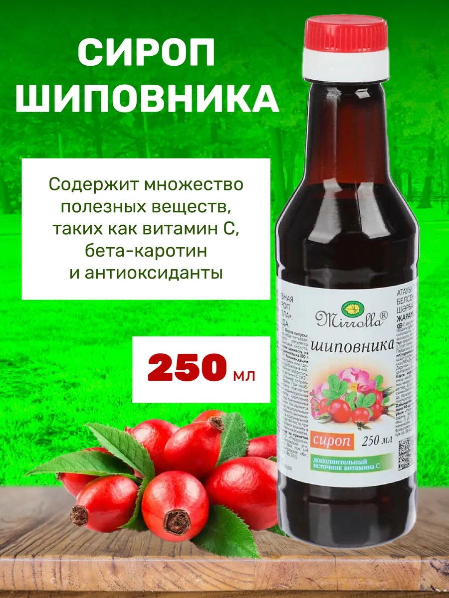 Rosehip syrup from Mirrolla is a biologically active food supplement based on natural rose hips, rich in vitamins C, A, group B, pectin and flavonoids.