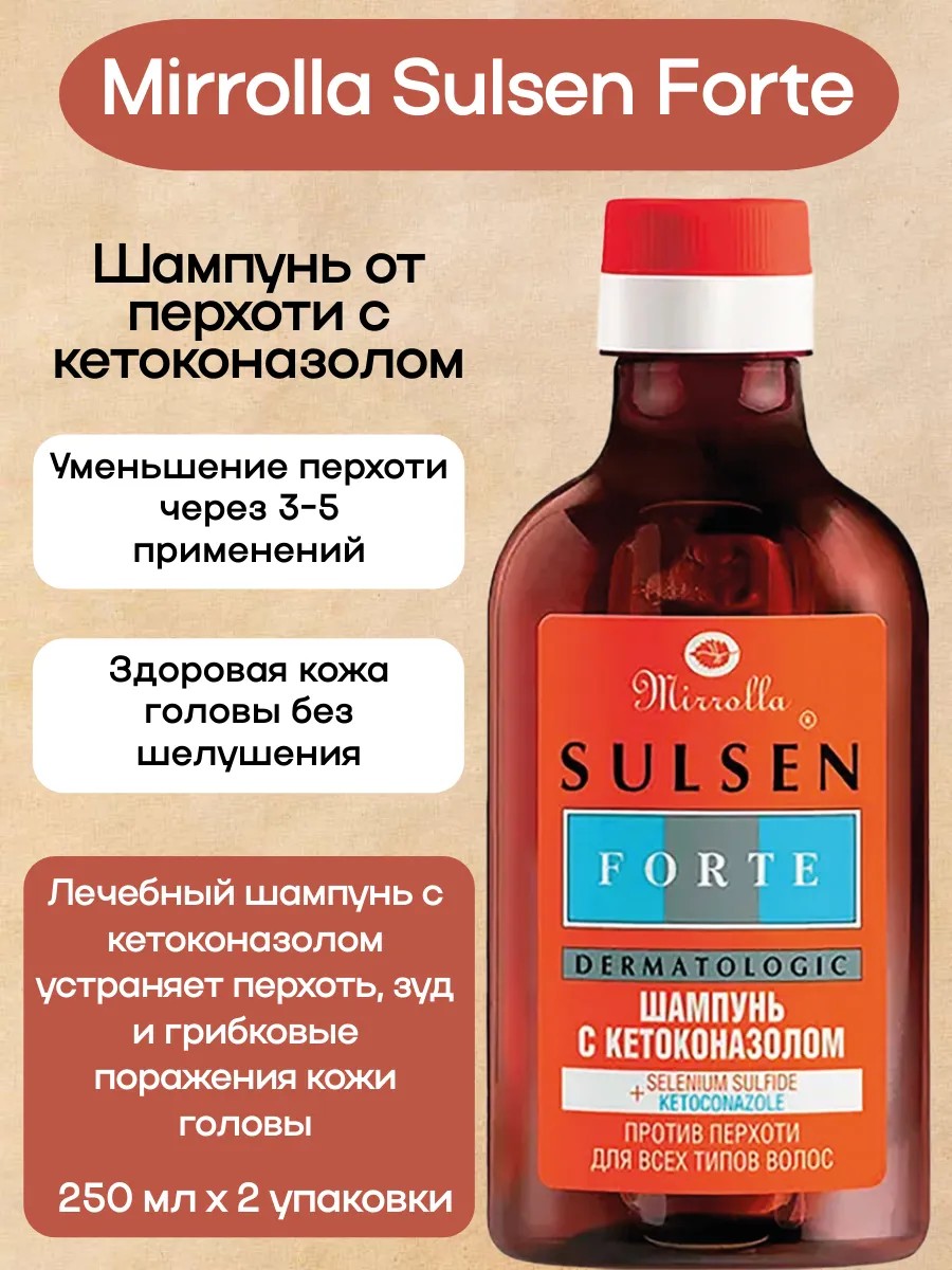 | Комплектация | 2 флакона; Сульсен Forte шампунь с кетоконазолом; мирролла шампунь против перхоти |