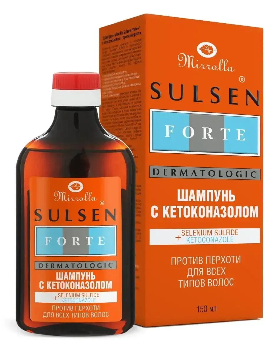 Шампунь «Мирролла Сульсен Форте» с кетоконазолом - против перхоти содержит дисульфид селена. Активный состав шампуня, в который входят Selenium Sulfide и Ketoconazole, оказывает выраженное противоперхотное действие, снимает раздражения и воспаления кожи головы, регулирует работу сальных желез. Мягкая моющая формула деликатно очищает волосы, без эффекта пересушивания.
