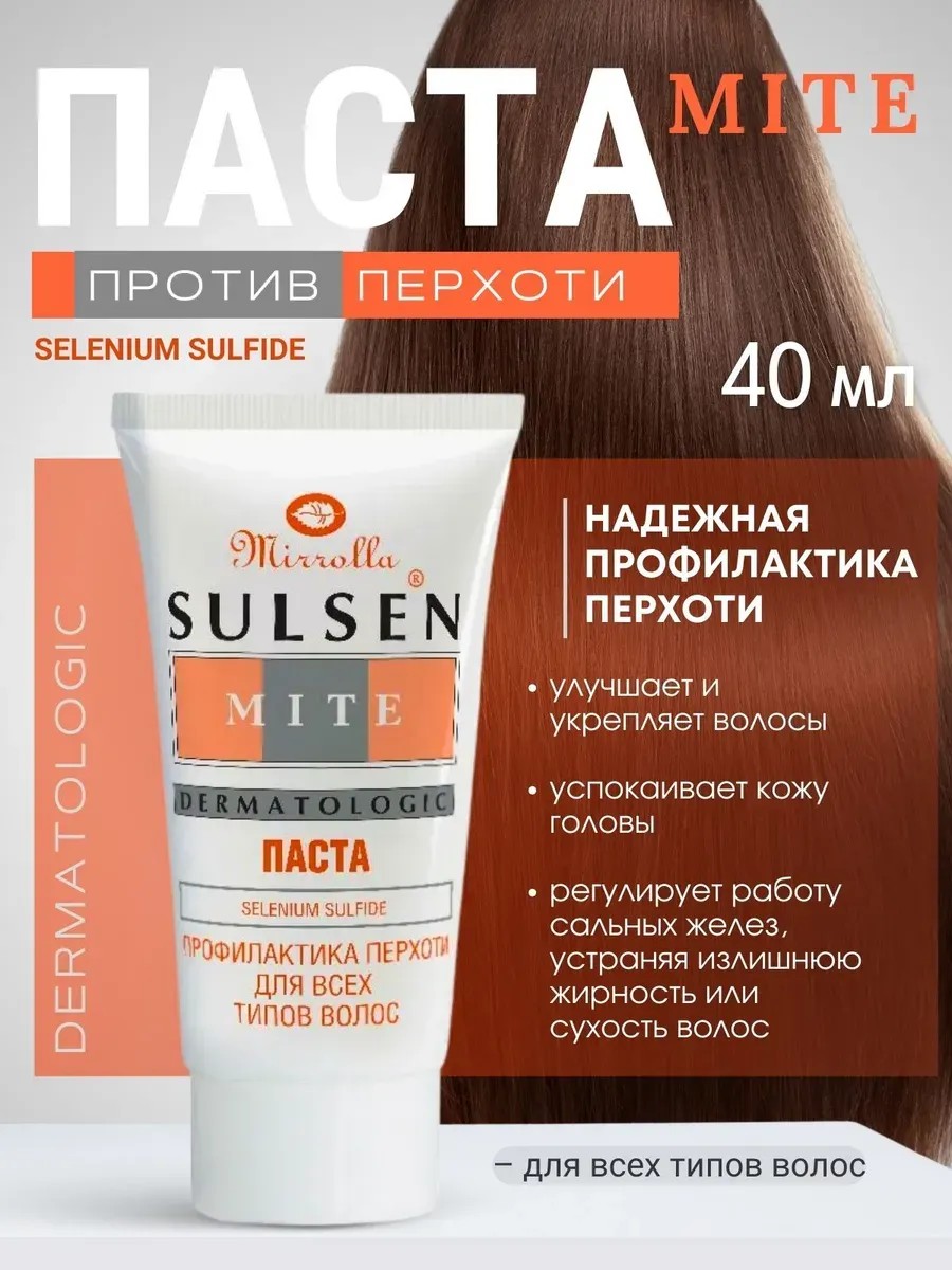Sulsen Mite paste from Mirrolla is an effective remedy for dandruff and seborrhea. The main active ingredient is selenium disulfide (sulsen), which normalizes the sebaceous glands and eliminates dandruff.