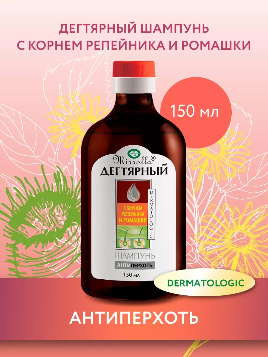 Серия дегтярных шампуней Мирролла: Шампунь дегтярный Mirrolla с экстрактом корня Репейника и Крапивы, Шампунь дегтярный Mirrolla с экстрактом корня Репейника и Красным перцем, Шампунь дегтярный Mirrolla с экстрактом корня Репейника и Ромашки. Благодаря наличию в составе биологически активного компонента – берёзового дёгтя, обладающего противомикробным и подсушивающим свойствами, шампунь улучшает состояние кожи головы и оказывает успокаивающее действие, предупреждает образование перхоти, способствует размягчению и удалению омертвевших клеток. Дегтярный шампунь способствует восстановлению силы и эластичности волос, придавая им естественный блеск. Экстракт корня репейника насыщает корни волос инулином, который стимулирует их рост и питает, а ромашка способствует ослаблению раздражений.Уменьшает раздражение кожи головы; Способствует устранению перхоти; Устраняет шелушение кожи головы; Улучшает структуру волос.
