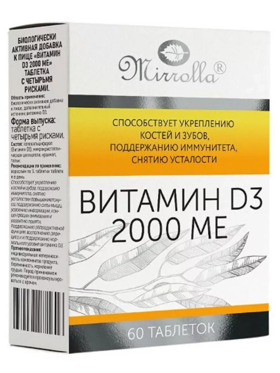 Мирролла Витамин D3 2000 МЕ - это биологически активная добавка (БАД) к пище, которая содержит витамин D3, необходимый для поддержания здоровья костей и зубов, а также для поддержания здоровья иммунной системы, снятию усталости и повышению тонуса, поддержанию силы мышц. Каждая упаковка содержит 60 штук таблеток, одна таблетка содержит 2000 МЕ витамина D3. Рекомендуется принимать в соответствии с рекомендациями врача или по инструкции. ВИТАМИН D3 2000МЕ - Биологически активная добавка (БАД) к пищеВнешний вид и свойства: белая или почти белая таблетка с четырьмя рискамиПрием в рекомендованной дозировке (1/4 таблетки в день) обеспечивает поступление Витамина D3 в количестве 500 ME (12,5 мкг), что составлет 250% от средней суточной потребности.*/***Технический регламент Таможенного союза 022/2011 Пищевая продукция в части ее маркировки.Приложение 2.**Не превышает верхний допустимый уровень потребления в сутки (Приложение 5 «Единых санитарно-эпидемиологических и гигиенических требований к товарам, подлежащим санитарно-эпидемиологическому надзору (контролю).Приём витамина D3 способствует улучшению общего состояния организма и укреплению иммунитета.Восполняет собой дефицит солнечного света.Способствует укреплению костей и зубов, поддержанию иммунитета, снятию усталости и повышению тонуса, поддержанию силы мышц.Способствует усвоению информации, концентрации внимания и развитию памяти, поддержанию репродуктивной функции, восполнению дефицита и поддержанию нормального уровня витамина D3.