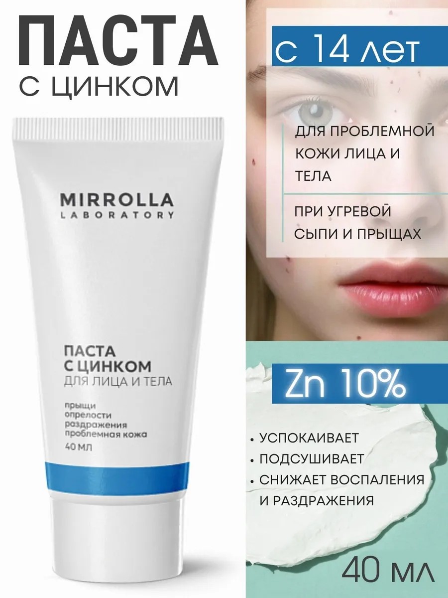 Mirrolla цинковая мазь - это надежное средство для здоровья и красоты проблемной кожи. Инновационная формула с оксидом цинка эффективно борется с высыпаниями и раздражениями, даря коже ухоженный вид - средство от угревой сыпи, точечное средство от акне, салициловая цинковая паста от псориаза, спецмазь от лишая для человека.