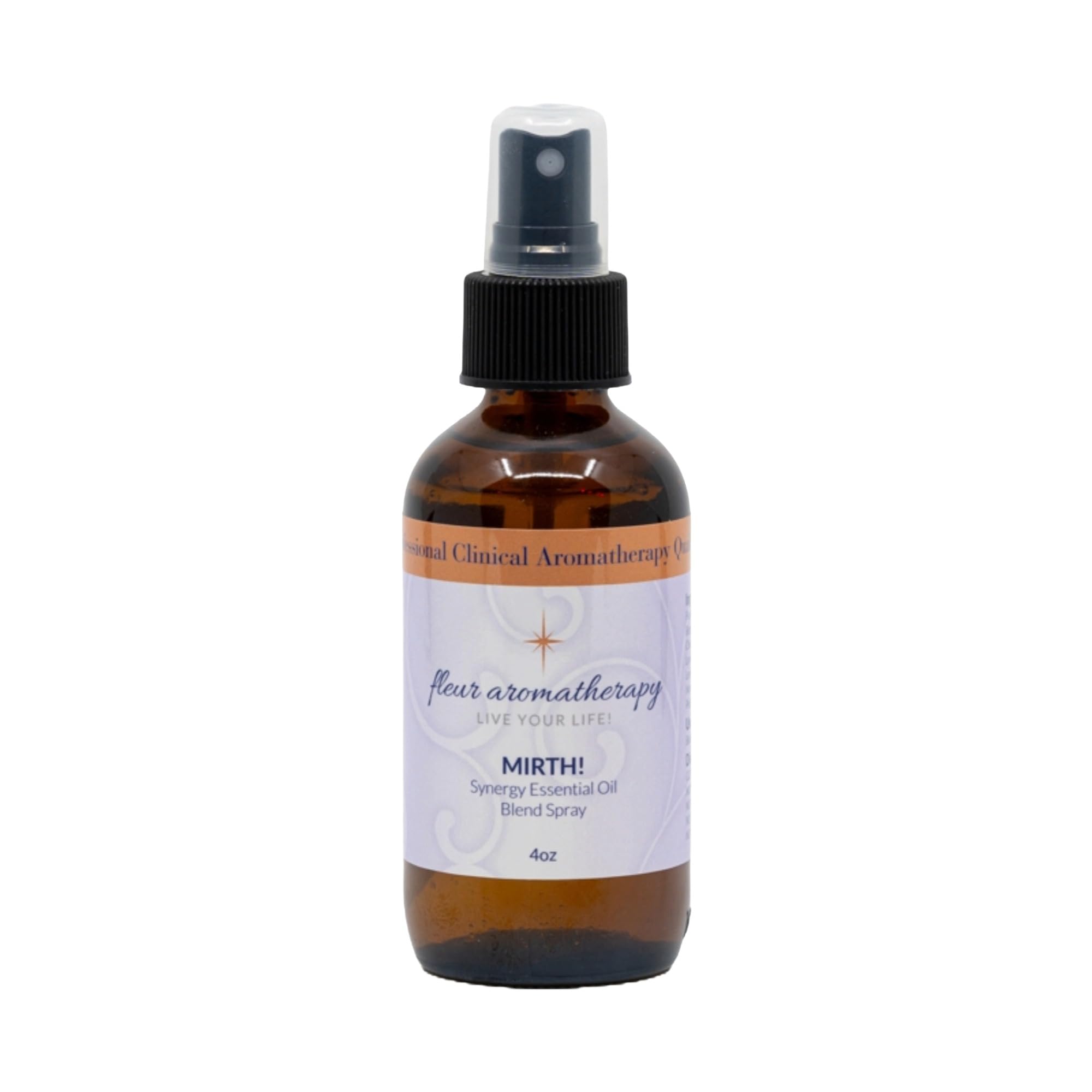 Find harmony with Fleur Aromatherapy's Mirth Synergistic Essential Oil Blend Spray. Featuring Bergamot FCF, Roman Chamomile, Lavender, Lemongrass, Sweet Marjoram, and Petitgrain. This balancing and uplifting blend is diluted to 6–8 in purified water for safe and versatile use. Mist into the air, onto linens, or around personal spaces to create a cheerful, harmonizing aroma that supports emotional well-being and tranquility throughout your day. Each oil is purity-tested and blended in small batches for professional aromatherapy quality. No Synthetics - No Pesticides - No Stretching - No Adulteration. Hand poured in the USA. FDA Disclaimer: This product has not been evaluated by the Food and Drug Administration. It is not intended to diagnose, treat, cure, or prevent any disease.Size: 4 oz Amber glass spray bottle with a fine mist sprayer for even and refreshing application. Professional Quality Safety: Purity-tested and hand poured in the USA. Professional aromatherapy quality. Woman and Veteran owned business. For external use only. Avoid eyes and mucous membranes. If pregnant, nursing, under medical care, or taking medication, consult a professional before use. Keep out of reach of children and pet. Supports Balance Upliftment: Offers a cheerful, harmonizing aroma that encourages emotional well-being and relaxation. Versatile Use: Mist into the air, onto linens, or around personal spaces to create a cheerful, harmonizing atmosphere that supports emotional well-being and relaxation. Pre-Diluted Ready-to-Use Aromatherapy Spray: Expertly blended with 100 pure Bergamot FCF, Roman Chamomile, Lavender, Lemongrass, Sweet Marjoram, and Petitgrain essential oils in purified water for safe topical and air application.