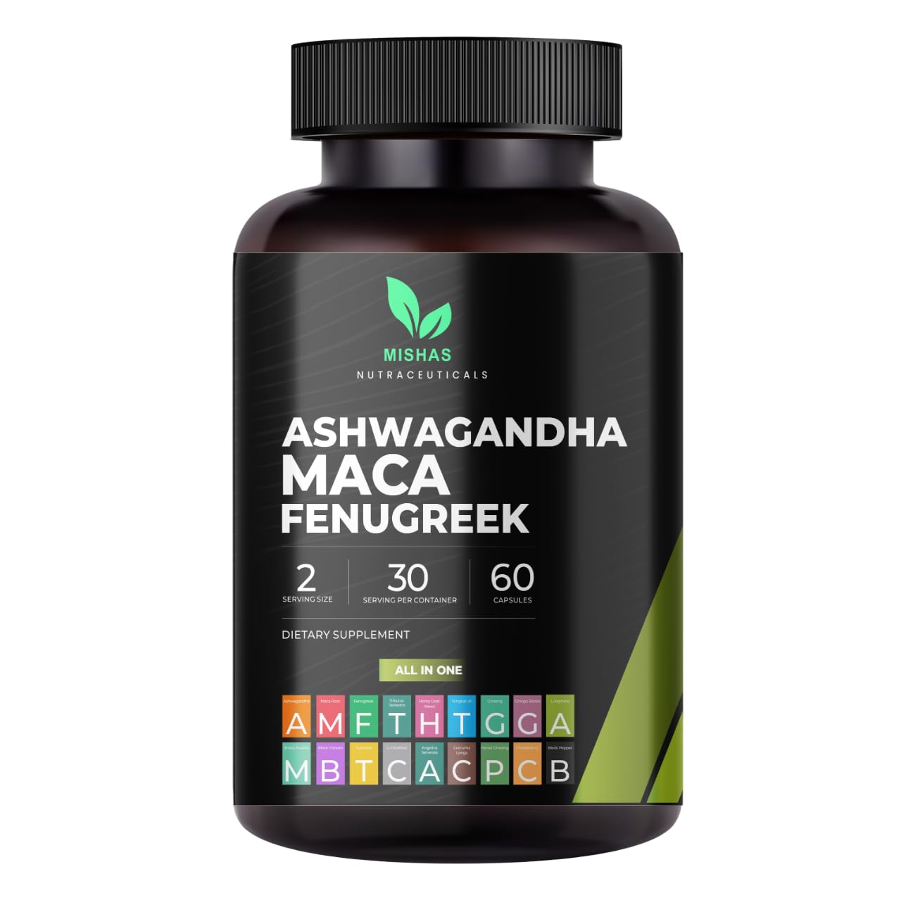 Mishas Nutraceuticals Ashwagandha, Maca Root, Fenugreek Supplement with Ginseng Supports Stress Relief, Mood Balance & Thyroid Health 60 Capsules 60 Count (Pack of 1)