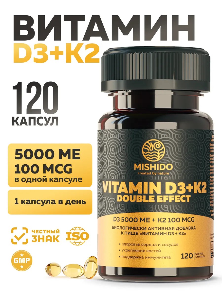 Витамин д3 + витамин К2 100 мкг - это сочетание двух важнейших питательных веществ. Витамины оказывают положительное влияние для роста волос и красоты кожи, что особенно важно для женщин . Витамин Д также необходим для мужчин и для детей , помогая поддерживать здоровье костей и иммунную систему. Витамин д и К2 максимально эффективно работают в комбинации друг с другом, витамин K2 влияет на здоровье кожи и метаболизм костей, способствует правильной работе мозга. Бады Витамин группы Д и К2 играют важную роль в регулировании уровня кальция и фосфора в организме, помогает против выпадения волос , для профилактики заболеваний сердечно-сосудистой системы. Данный комплекс витаминов отлично подойдет для всей семьи, лучший помощник для иммунитета от простуды и гриппа . Бад также показан для подростков , для улучшения памяти, помогает сохранять концентрацию. Регулярный прием способствует улучшению защитных свойств организма, в одной капсуле содержится суточная норма vitamin d3 . Дефицит витамин д наблюдается у 80% людей, проживающих в России, независимо от региона, особенно в холодное время года. Рекомендации по применению: по 1 капсуле в день во время еды. Продолжительность приема - 1 месяц. При необходимости приём можно повторить. Возможны повторные приемы в течение года. Энергетическая и пищевая ценность на 100 г продукта: белки - 33 г, жиры - 59 г, углеводы – 0 г, 647 ккал / 2717 кДж. Позаботьтесь о своем здоровье и здоровье своих близких, добавив витамин d3 + К2 в свой рацион.