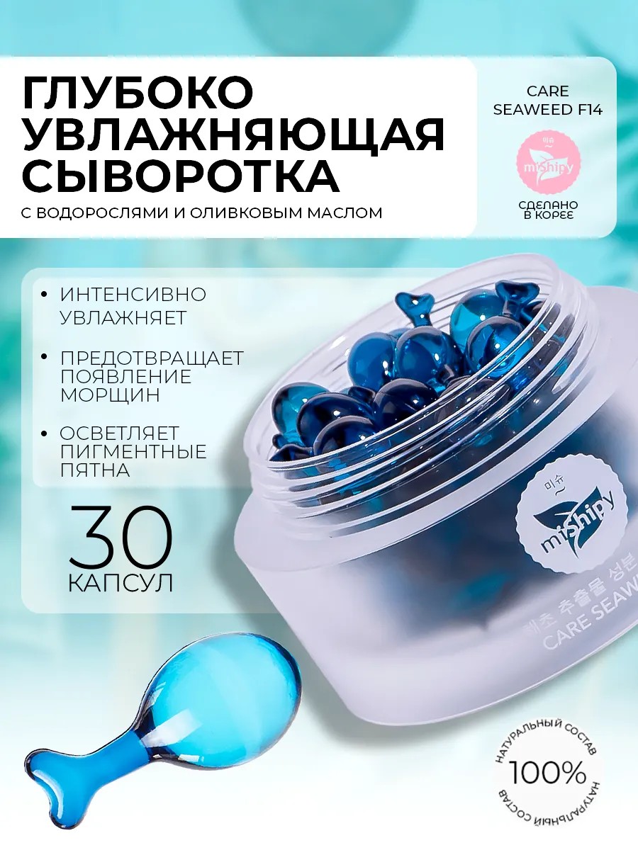 Увлажняющая сыворотка для лица CARE SEAWEED F14 интенсивно увлажняет, борется с пигментными пятнами и предотвращает образование морщин. После курса применения средства восстанавливается естественный водный баланс кожи и улучшается метаболизм клеток. Содержит ретинол и уникальный компонент EGF. Он регулирует деление и рост клеток, проникает в эпидермис и становится катализатором биохимических процессов, участвующих в поддержании красоты и молодости кожи. Сыворотка представлена в удобных капсулах из экологичного желатина, каждая из которых рассчитана на одно применение. Оболочка не допускает попадания микробов и воздуха, при этом сохраняя активные компоненты средства. Оно наполнено сбалансированным составом натуральных компонентов и разработано с использованием передовых корейских технологий. Количество в упаковке: 30 шт. Произведено в Корее. Подходит для сухой кожи с первыми признаками старения. Корейская косметика miShipy идеальна для ухода за кожей лица, глаз, тела, а также за волосами. В каталоге бренда представлен большой ассортимент продуктов для приумножения вашей естественной красоты. В составы входят витамины, некомедогенные натуральные масла и экстракты, пептиды, аминокислоты. Для осветления тона мы предлагаем сыворотку с витамином С, для лечения акне – с ретинолом или ниацинамидом. Вы сможете подобрать подходящее средство для любых потребностей. Уходовая косметика бренда подходит для подростков. Способ применения: вскройте капсулу руками или ножницами, выдавите содержимое на ладонь и распределите лёгкими движениями до полного впитывания. Не требует смывания. Рекомендуем использовать утром и вечером, периодически курс повторять. Вскрытую капсулу хранить не более суток. В случае затвердевания оболочки рекомендуем хранить открытую банку в ванной комнате или месте с высокой влажностью до возвращения ей мягкости.