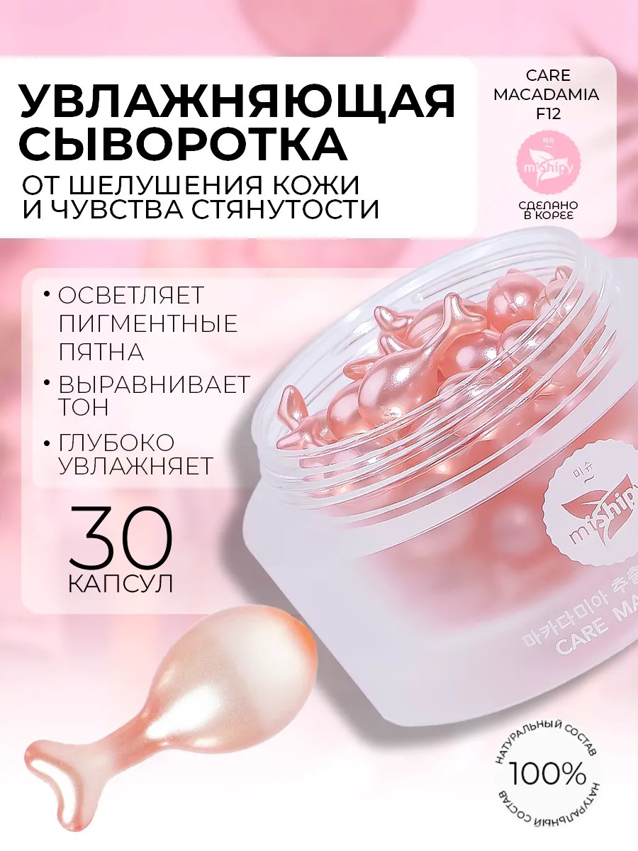 CARE MACADAMIA F12 Moisturizing Facial Serum with red algae and rosemary leaf extracts deeply nourishes and hydrates the skin, eliminating flaking and tightness. It actively combats fine lines and age spots, improves tone and elasticity, restores after UV radiation, and has a brightening effect. The serum contains collagen, hyaluronic acid, macadamia oil, jojoba oil, and a unique component—epidermal growth factor (EGF). EGF regulates cell division and growth, penetrates the epidermis, and catalyzes biochemical processes involved in maintaining beauty and correcting wrinkles. This anti-aging serum comes in convenient, single-use, eco-friendly gelatin capsules. The capsules seal out germs and air while preserving the active ingredients of the facial care product. It is filled with a balanced composition of natural ingredients and developed using advanced Korean technology. Quantity per package: 30 pcs. Made in Korea. Suitable for all skin types. Directions: Open the capsule, squeeze the contents into your palm, and spread with gentle movements until completely absorbed. No rinsing required. We recommend using morning and evening, repeating the course periodically. Store the opened capsule for no more than 24 hours. If the shell hardens, keep the open jar in the bathroom or a highly humid place until softened. You can find ALL CERTIFICATES OF CONFORMITY in the product card.