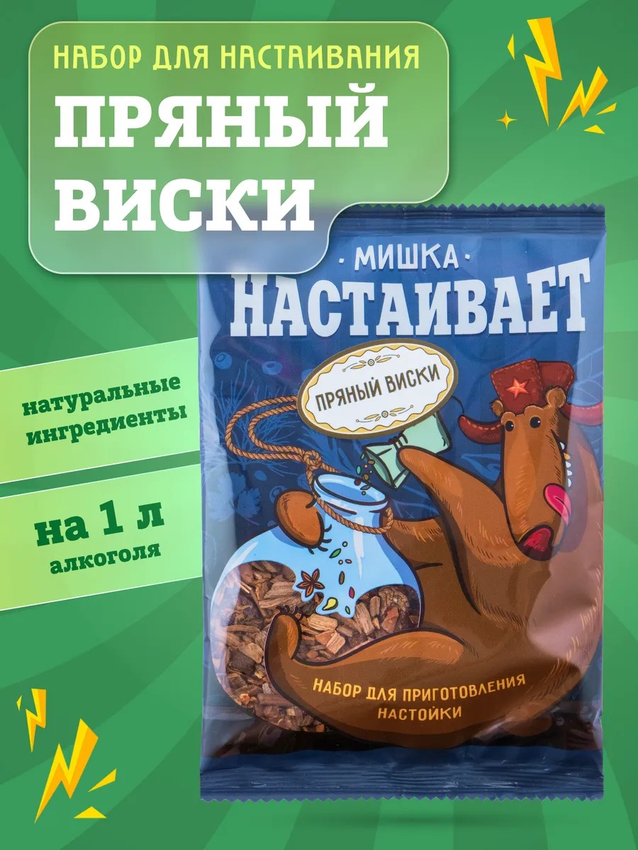 "Набор Мишка настаивает ""Пряный виски"" создан для приготовления настойки на самогоне или водке 40%. Сочетание дуба, ванили, корицы, изюма, апельсина, черного перца, имбиря, мускатного ореха и солода. Этот набор для настоек подарит вам напиток с насыщенным ароматом пряных специй и мягким вкусом, который идеально подходит для ценителей классических алкогольных традиций.