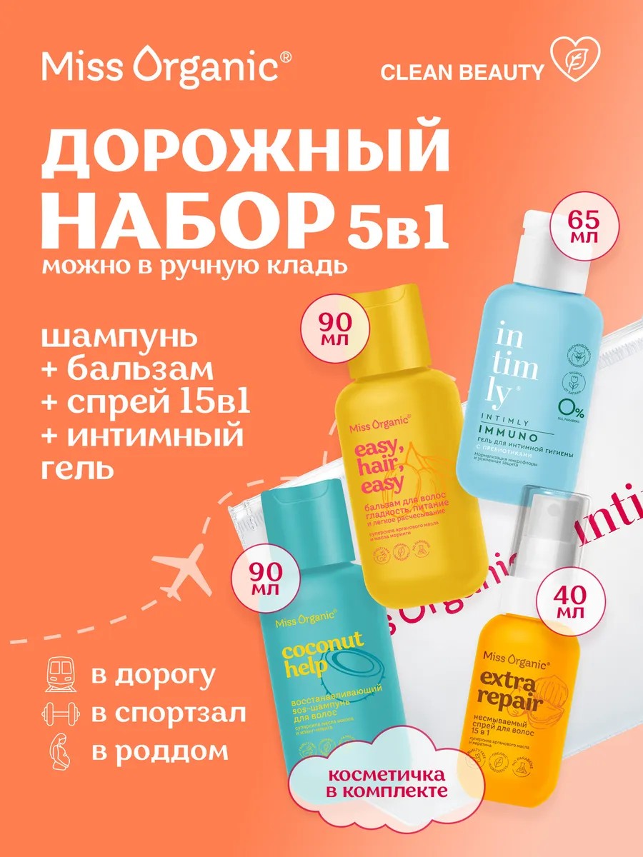 | Комплектация | Гель для интимной гигиены Intimly 65мл с пребиотиками - 1шт.; Несмываемый спрей для волос Экспресс-уход 15 в 1 Miss Organic 40мл - 1шт., Косметичка - 1шт.; SOS-шампунь для волос Miss Organic 90мл - 1шт, Бальзам для волос Miss Organic 90мл - 1шт. |