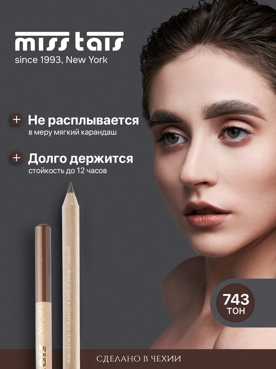Our store is the only official distributor of Czech decorative cosmetics from the Miss Tais brand in Russia! The Miss Tais matte eye brow and eye contouring pencil in the universal shade 743 natural brown is ideal for everyday, long-lasting makeup. The wooden barrel of this hypoallergenic pencil is made of natural Californian cedar, which has antiseptic properties, preventing the growth of bacteria on the lead. The Miss Tais contouring pencil applies and blends smoothly, creating a microblading effect. After application, it hardens and does not smudge. You can draw perfectly shaped eyebrows, use it as a brown eyeliner, draw eyeliner, and outline the inter-lashes of sensitive eyes. The Miss Tais pencil has many advantages. Firstly, it is available in a variety of natural warm and cool dark brown shades, ensuring that your brows look as natural as possible and perfectly match your skin tone. Secondly, it's rain- and heat-resistant, maintaining a flawless brow line all day long in summer. This wax eyebrow pencil is easy to apply, leaves no marks, and doesn't roll off the skin. The professional soft eyebrow pencil from Miss Tais is a popular makeup assistant for both beginner and experienced makeup artists, whether planning a beautiful everyday look or an evening makeup look. Its long-lasting cosmetic texture and the ability to create various makeup effects make this product the best basic choice for everyone. It's a great New Year's beauty gift for beloved adults and young girls—for moms, wives, or aunts on Mother's Day or Christmas, or for girlfriends, teenage sisters, or colleagues on March 8th, February 14th, and New Year's. Please note: The product may slightly differ from the photograph in terms of brightness, tone, or saturation due to monitor settings and studio shooting.