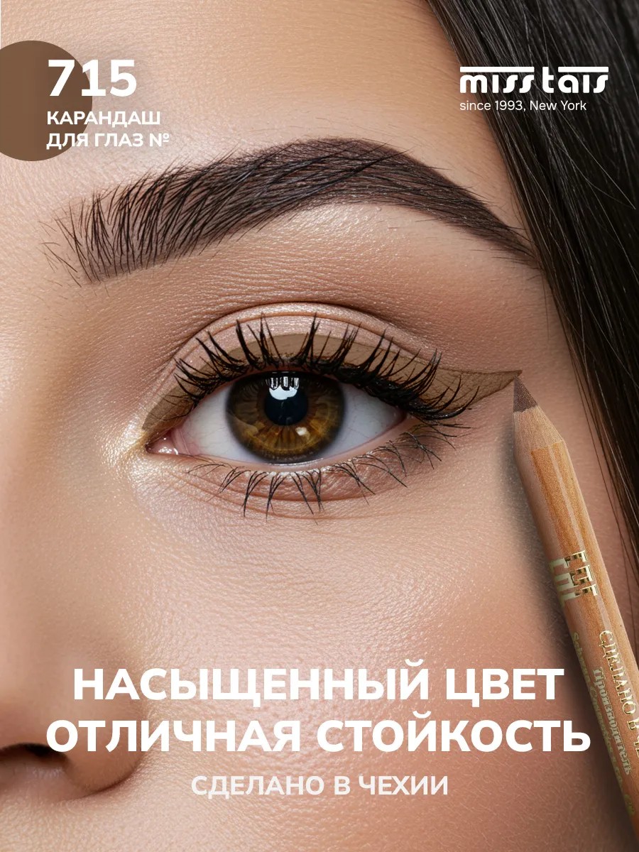 Our store is the only official distributor of Czech Miss Tais decorative cosmetics in Russia! The Miss Tais matte eye pencil in shade 715 Pearlescent Chocolate is ideal for evening and everyday long-lasting makeup. It contains wax, making application easy and comfortable, even on sensitive skin. The wooden barrel of this hypoallergenic pencil is made of natural Californian cedar, which has antiseptic properties that prevent bacteria from growing on the lead. The Miss Tais colored pencil applies and blends smoothly, without smudging. It's equally convenient for drawing, creating a fine, precise line, or creating a shading effect. You can create dark, khaki-colored cat-eye lines with a perfectly shaped contour, or use them as a gray-green eyeliner. The Miss Tais eyeliner pencil is available in a variety of vibrant, warm, and cool shades, and is rain-resistant and smudge-resistant, even in the summer heat. The wax pencil is easy to apply, leaves no marks, and doesn't crease. This professional, soft eye pencil from Miss Tais is a popular makeup aid for both beginner and experienced makeup artists, whether planning a beautiful everyday look or a special occasion. Its long-lasting texture and the ability to create various makeup effects make it the perfect basic choice for everyone. It's a perfect New Year's beauty gift for your favorite adult women and young girls—for your mom, wife, or aunt for Mother's Day or Christmas, or for your friend, teenage sister, or colleague for March 8th, February 14th, or New Year's. Attention! There may be slight differences in color (brightness, tone, or saturation) between the product and the photograph, due to monitor settings and studio shooting.
