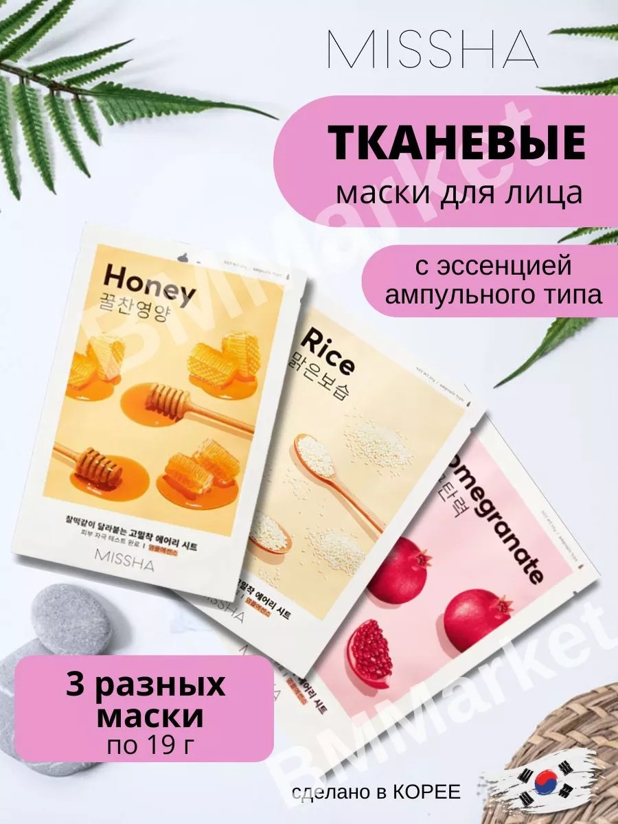 Набор косметических тканевых маскок Missha Airy Fit Sheet Mask – уход за кожей лица на основе натуральных овощей, растительных экстрактов и природных компонентов, позволяющий быстро и эффективно привести Вашу кожу в порядок. Корейские маски для лица Миша пропитаны эссенцией ампульного типа. Превосходно справляются с увлажнением лица, насыщают кожу витаминами, макро- и микроэлементами. Мягкая, тонкая ткань, обильно пропитанная эссенцией, комфортно ложится на лицо и обеспечивает плотное прилегание маски к коже, не сползает и не течёт. Благодаря более длительному контакту с кожей, активные природные компоненты в составе маски глубже проникают в клетки кожи и эффективнее справляются с решением уходовых задач, чем при нанесении классических сывороток для лица. Каждая из тканевых масок missha корея решает определённую задачу и подбирается, исходя из состояния и потребностей Вашей кожи. Мед убирает сухость кожи и шелушение, разглаживает микрорельеф кожи, придает упругость и эластичность, делает кожу лица бархатистой и улучшает её цвет. Рис увлажняет, стимулирует обновление кожи, обладает отбеливающими свойствами и снижает интенсивность веснушек, пигментных пятен и покраснений. Гранат оказываут на кожу омолаживающее действие, способствует стимулированию выработки коллагена, помогает насыщать эпидермис витаминами и влагой, снимать раздражение и усталость. 100% Оригинальная корейская женская косметика. Маска для лица missha легко наносится и снимается. Благодаря структуре волокон и тончайшей основе идеально прилегает к коже, позволяя полезным ингредиентам максимально впитаться в слои эпидермиса. Маски для лица корея миша позволяют быстро освежить и увлажнить кожу, выровнять тон, улучшить цвет лица, придать коже здоровый вид и сияние. Подходят для всех типов кожи, для чувствительной и сухой кожи. Нанесите маску на очищенную кожу, оставьте на 15-20 минут, затем снимите. Маски станут идеальным подарком на новый год, 8 марта для любой женщины и девушки.