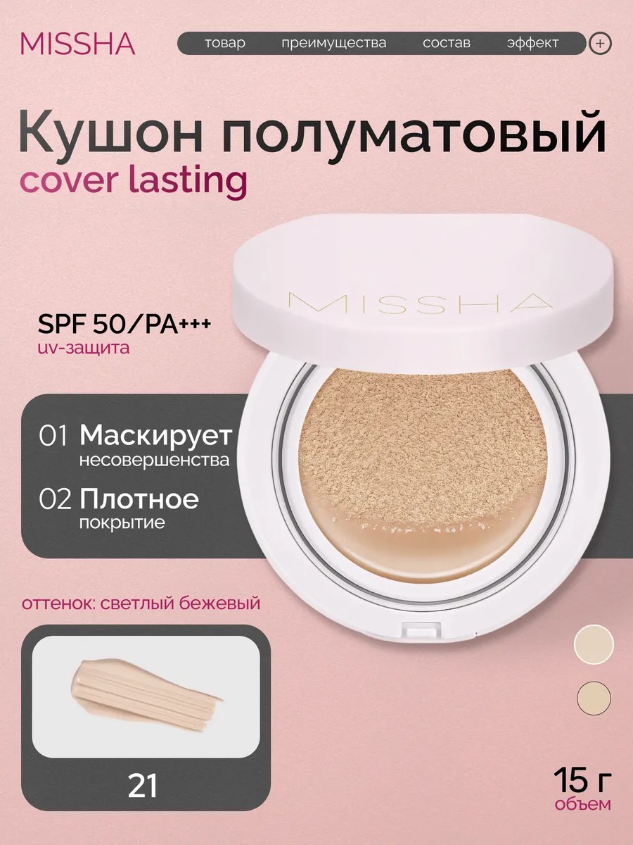 MISSHA Cushion with a semi-matte finish Cover Lasting SPF50+/PA+++ 21 shades