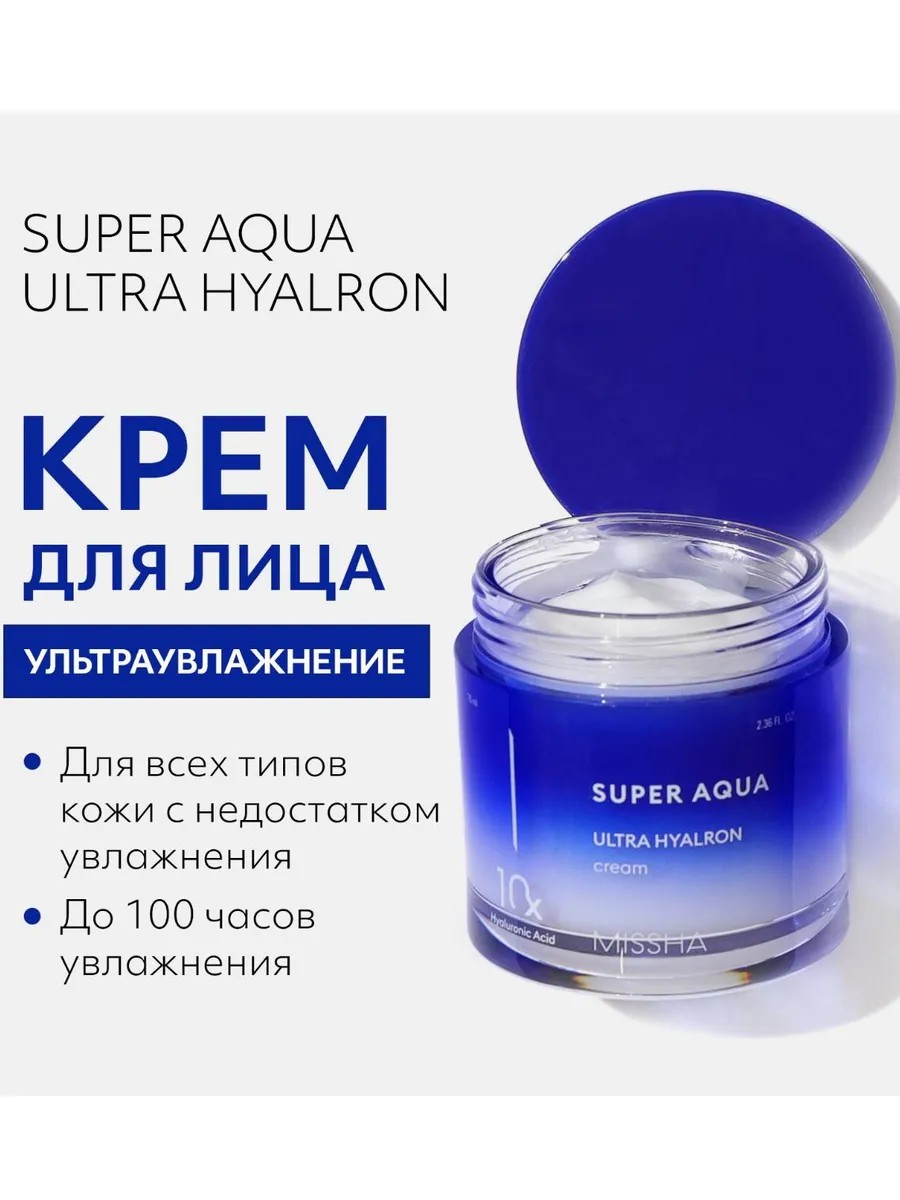 Регулярный уход за кожей лица с помощью крема MISSHA Super Aqua Ultra Hyalron Cream напитывает и омолаживает кожу, делает её гладкой и нежной наощупь, заживляет воспаления и выравнивает тон.