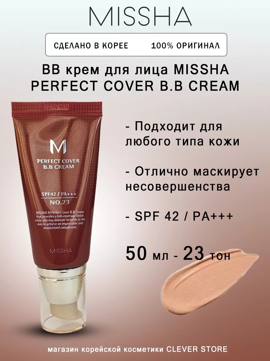 Самый известный и самый популярный крем MISSHA M Perfect Cover BB Cream. Этот крем многофункционален, он служит базой под макияж, несет в себе функции тонального крема и консилера; имеет защиту от солнца и очень большую: SPF 42 / PA+++, а также хорошо увлажняет кожу и борется с воспалениями, то есть имеет полноценный ухаживающий состав. Великолепный маскирующий эффект благодаря прекрасному покрытию, отбеливанию пигментных пятен, интенсивному увлажнению, улучшению текстуры кожи благодаря растительным экстрактам и питательным ингредиентам. В составе этого крема присутствует экстракт розмарина, масло из семян розы и жожоба, масло макадамии, экстракт водорослей, экстракт икры, коллаген и гиалуроновая кислота, арбутин и аденозин. Благодаря своему составу крем поддерживает тонус кожи, делает кожу упругой и подтянутой, хорошо увлажняет, питает кожу витаминами. Благодаря экстракту ромашки, крем обладает заживляющим и успокаивающим эффектом. Подходит для любого типа кожи. "Держится" весь день. Сочетание легкости текстуры и высокой плотности пигментов позволяет выровнять тон кожи, скрыть недостатки и при этом сохранить естественный и свежий вид.