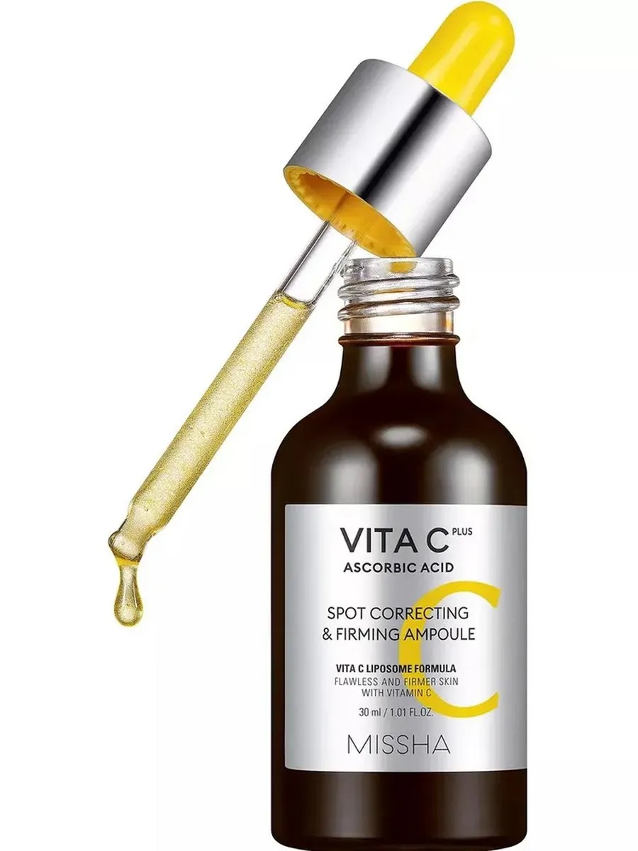 MISSHA Vita C Plus Spot Correcting & Firming Ampoule. This anti-aging vitamin C serum has a regenerating effect, boosts cellular metabolism, and evens out skin tone and texture. Vitamin C breaks down pigment in the upper layers of the epidermis, prevents pigmentation, and lightens age spots. It also boosts cellular metabolism, thereby increasing the production of collagen and elastin fibers, which improves skin elasticity and has a rejuvenating effect. This serum contains encapsulated vitamin C, which perfectly stabilizes vitamin C and ensures its deep penetration into the skin. Licorice extract, enriched with antioxidants, improves skin elasticity, helps fight wrinkles, and has an antibacterial effect. Collagen, hyaluronic acid, ceramides, and a peptide complex provide a moisturizing and rejuvenating effect, stimulating cell regeneration and renewal. Directions: Apply a few drops of serum to the skin with light, smoothing movements and allow to absorb.