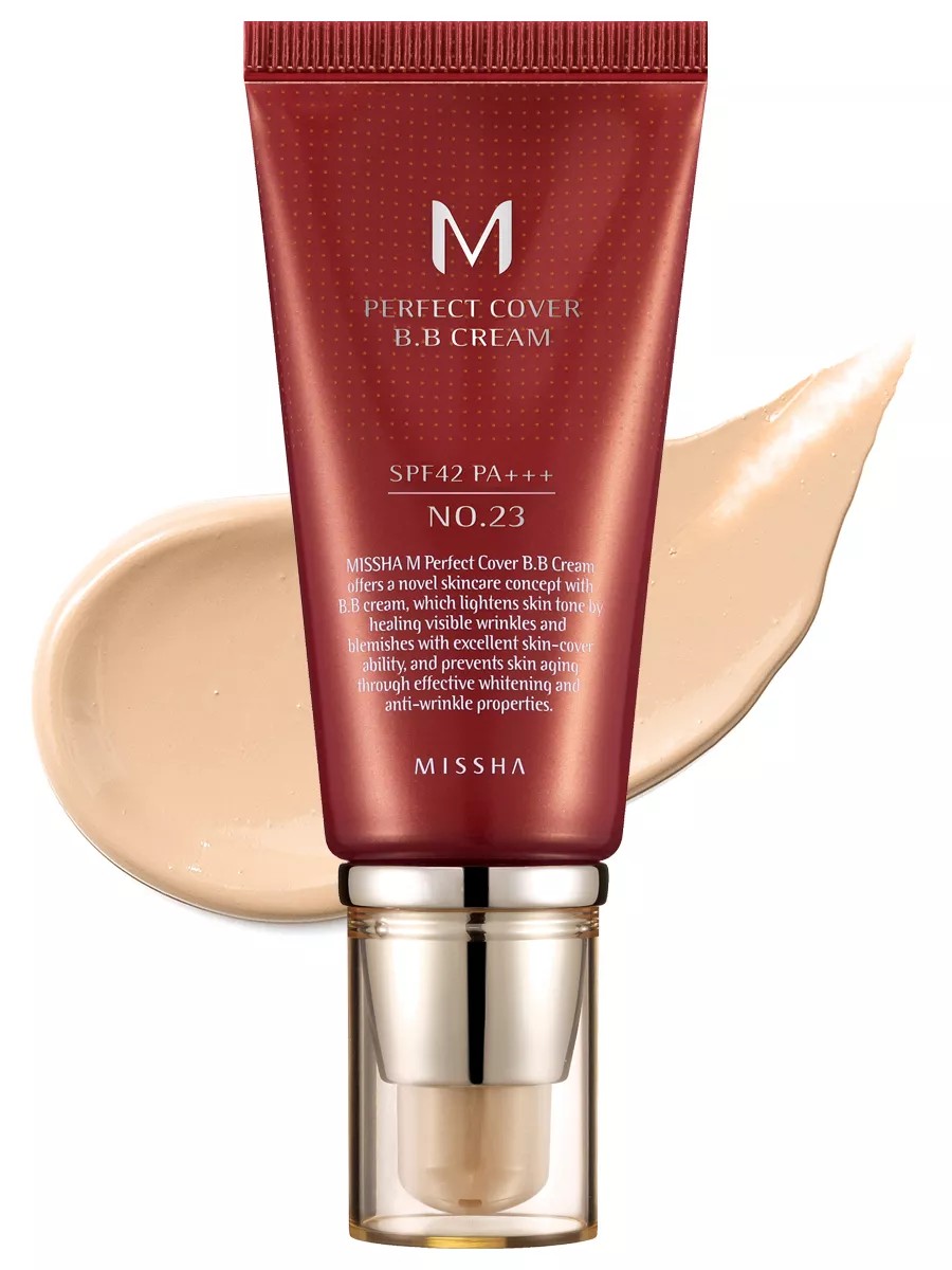 Missha Тональный BB крем Идеальное покрытие Perfect Cover BB Cream SPF42/PA, тон 23 50мл. Тональный BB-крем MISSHA (Миша) – самый продаваемый BB-крем в мире. Он превосходно справляется с тремя базовыми функциями BB-средств (Beauty balm, бальзам красоты) – идеальный макияж лица, инновационный уход за кожей и высокая степень защиты от солнца. С первых дней BB тональный крем для лица матовый MISSHA получил высокую оценку профессиональных визажистов по всему миру. bb-крем тональный корея MISSHA M Perfect Cover создаёт невесомое матовое покрытие без «эффекта маски». Миша тональный крем для лица матирующий подстраивается под Ваш естественный тон кожи, скрывая несовершенства и заметно улучшая цвет лица. Тональник светлый обеспечивает стойкое покрытие без жирного блеска до 30 часов. Не меняет оттенок в течение дня, не темнеет, не скатывается. Благодаря мягкой кремовой текстуре BB крем MISSHA М Perfect Cover легко и быстро наносится, равномерно растушёвывается. Идеально перекрывает тёмные круги под глазами, маскирует покраснения и заметно осветляет пигментные пятна. Гиалуроновая кислота и керамиды, входящие в состав BB-крема, поддерживают гидролипидный баланс кожи, насыщая её влагой и поддерживая комфортное увлажнение в течение всего дня. Растительный комплекс Gatuline RC (экстракт буковых почек) обладает выраженным омолаживающим действием: увлажняет кожу, защищает от преждевременного старения, укрепляет структуру эпидермиса и уменьшает глубину мимических морщин. Экстракты розмарина и ромашки смягчают кожу, оказывают успокаивающее, противовоспалительное и антиоксидантное действие. Тональный BB-крем MISSHA M подходит для всех типов кожи, в том числе для чувствительной области вокруг глаз. Эффективно защищает от вредного воздействия солнечных лучей спектра UVA и UVB, фактор защиты SPF 42/PA +++. Тональный BB-крем MISSHA M Perfect Cover – идеальное покрытие для Вашей кожи: здоровый цвет, свежесть и сияние на весь день!