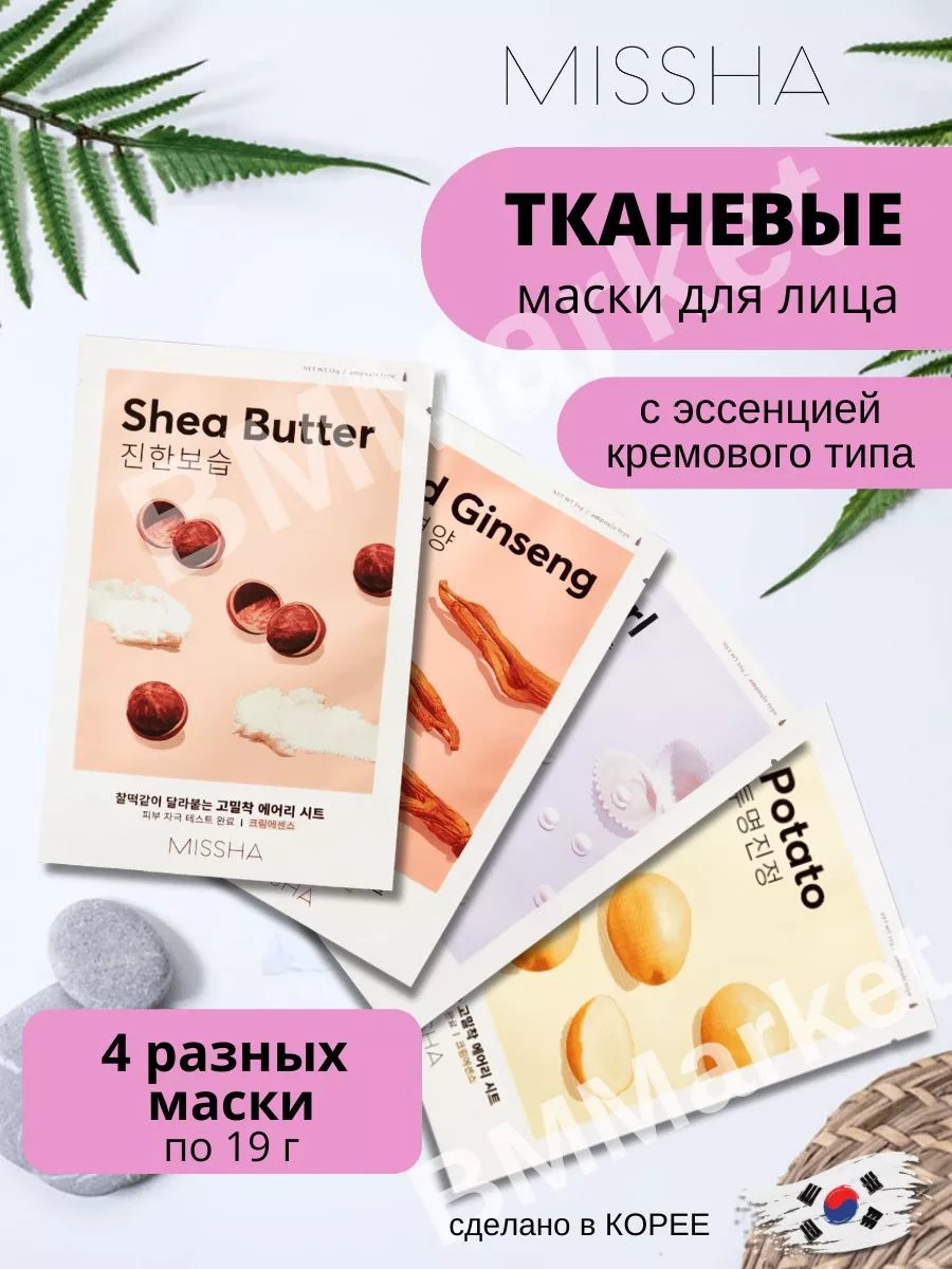 Набор косметических тканевых маскок Missha Airy Fit Sheet Mask – уход за кожей лица на основе натуральных овощей, растительных экстрактов и природных компонентов, позволяющий быстро и эффективно привести Вашу кожу в порядок. Корейские маски для лица Миша пропитаны эссенцией кремового типа. Превосходно справляются с увлажнением лица, насыщают кожу витаминами, макро- и микроэлементами. Мягкая, тонкая ткань, обильно пропитанная эссенцией, комфортно ложится на лицо и обеспечивает плотное прилегание маски к коже, не сползает и не течёт. Благодаря более длительному контакту с кожей, активные природные компоненты в составе маски глубже проникают в клетки кожи и эффективнее справляются с решением уходовых задач, чем при нанесении классических сывороток для лица. Каждая из тканевых масок missha корея решает определённую задачу и подбирается, исходя из состояния и потребностей Вашей кожи. Масло ши (каритэ) устраняет шелушения, активно питает кожу, смягчает эпидермис и оказывает омолаживающее действие. Красный женьшень регулирует и нормализует обменные процессы, разглаживает морщины, интенсивно питает и уменьшает пигментацию. Жемчуг обладает увлажняющим, смягчающим, осветляющим действием. Картофель повышает эластичность кожи, способствует выработке коллагена, осветляет пигментацию, повышает иммунитет кожи. 100% Оригинальная корейская женская косметика. Маска для лица missha легко наносится и снимается. Благодаря структуре волокон и тончайшей основе идеально прилегает к коже, позволяя полезным ингредиентам максимально впитаться в слои эпидермиса. Маски для лица миша позволяют быстро освежить и увлажнить кожу, выровнять тон, улучшить цвет лица, придать коже здоровый вид и сияние. Подходят для всех типов кожи, для чувствительной, зрелой и сухой кожи. Нанесите маску на очищенную кожу, оставьте на 15-20 минут, затем снимите. Маски станут идеальным подарком на новый год, 8 марта для любой женщины и девушки.