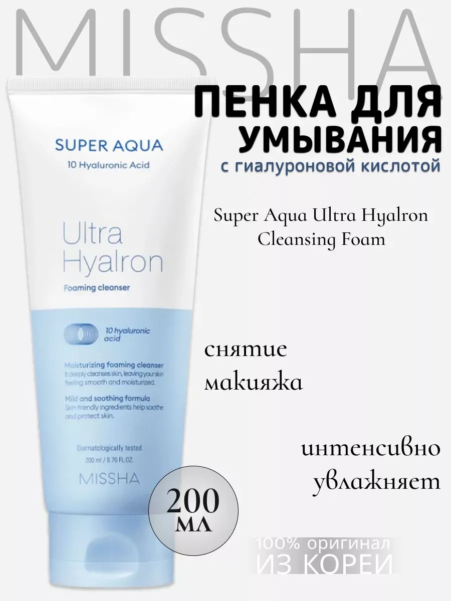 Освежающая пенка для лица Super Aqua Ultra Hyalron Cleansing Foaming обладает мягкой формулой, которая подходит даже очень чувствительной и тонкой кожи.Пена имеет тающую, легкую и шелковистую текстуру, которую наносить на кожу одно сплошное удовольствие. Насыщенная кремовая текстура пенки при контакте с водой превращается в пышную густую пену с множеством мельчайших пузырьков, эффективно и мягко очищающих кожу. Гель для умывания Missha Foaming Cleanser тщательно удаляет ежедневный базовый макияж, праймеры, хайлайтеры, тональные BB-кремы и солнцезащитные средства. Мягко очищает кожу от излишков себума, пыли, загрязнений и омертвевших клеток рогового слоя. А ухаживающие компоненты пенки сохраняют кожу увлажнённой, без чувства стянутости даже после очищения. С помощью пенки вы проведете своей коже настоящий детокс, улучшите кровоток, укрепите стенки сосудов и замедлите процессы старения на долгий срок. Очищающая пенка для лица Миша содержит новый 10-ти ступенчатый комплекс гиалуроновой кислоты разной плотности. Густая и мягкая пена прекрасно справляется с удалением загрязнений. Мягкая формула, не оставляющая ощущения стянутости, подходит для ежедневного очищения. Не содержит искусственных отдушек. Дерматологически тестировано. Маннитол в составе обеспечивает легкую эксфолиацию, очищение пор. 10-ти ступенчатый комплекс гиалуроновой кислоты разной плотности увлажняет и поддерживает уровень влаги на всех эпидермальных слоях. Умывалка Миша также помогает увлажнить и утеплить кожу, делая её заметно мягче и более эластичной. Умывашка подходит как для жирной, так и для сухой кожи, делая её более здоровой и сияющей. Гиалуроновая кислота обеспечивает необходимый уровень увлажнения. Наслаждайтесь заботой о себе с этим корейским продуктом из Кореи, который не только эффективно удаляет макияж, но и бережно ухаживает за вашей кожей.