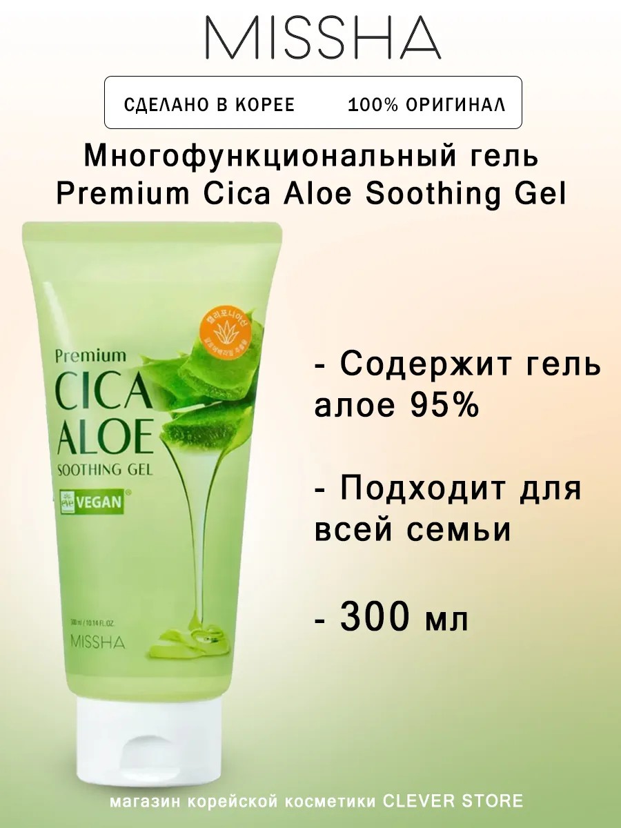 Многофункциональный универсальный гель Missha Premium Cica Aloe Soothing Gel в объёме 300 мл, который может использоваться для всей семьи. Легкий, прозрачный гель, в составе которого натуральный алоэ вера, пригодится как для ухода за кожей лица, так и для других, не менее полезных целей.