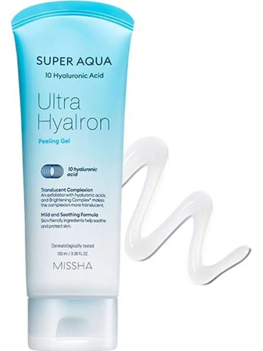 Missha Super Aqua Ultra Hyalron Peeling Gel (Korean) 100 ml. This gentle peeling gel with a hyaluronic acid complex, in addition to its gentle exfoliation, also provides maximum long-lasting hydration to all layers of the epidermis, leaving skin feeling renewed, soft, and velvety. This gommage peeling effectively yet gently removes dead skin cells from the surface of the epidermis, removes excess sebum and other impurities, softens and smoothes the skin's microrelief, brightens the overall skin tone, and makes it smoother and more radiant. This gommage-like texture and contains cellulose particles makes it very gentle and delicate, making it suitable for sensitive skin. A complex of 10 types of hyaluronic acid provides prolonged moisturizing care. Hyaluronic acid deeply and intensely hydrates the skin, delivering it to the deep layers of the epidermis and promoting moisture retention. It helps maintain optimal hydration levels over time. Directions: Apply to clean, dry skin and massage with your fingertips for 2-3 minutes. Wash your face with warm water and apply cream.