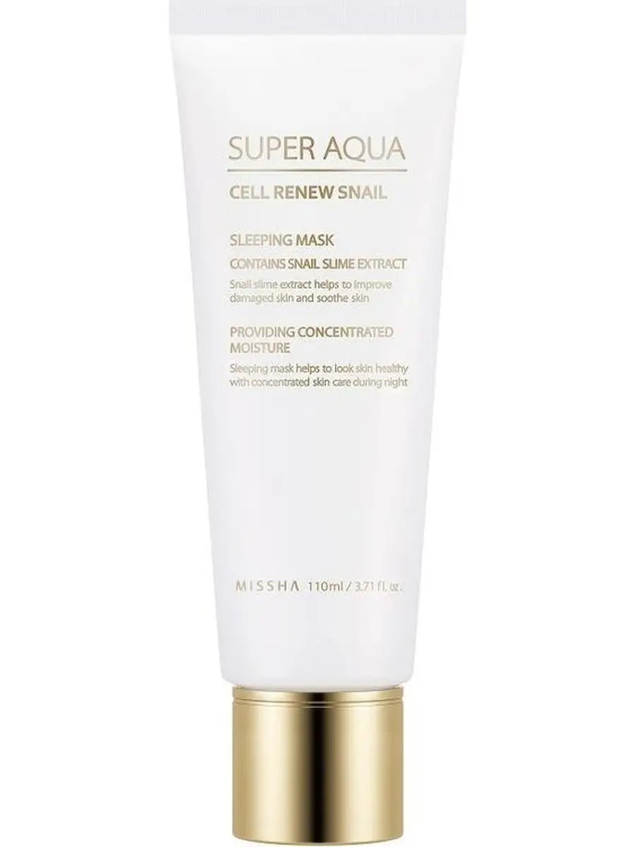 Korean Regenerating Night Face Mask MISSHA Super Aqua Cell Renew Snail Sleeping Mask Korea 110 ml contains natural snail extract. These snails were brought from France and grown in ecologically clean areas of Korea. The mask also contains plant stem cell extract, which fights pigmentation and imperfections, makes the skin tone even and fills the skin with vital energy. Mask **Missha Super Aqua Cell Renew Snail Sleeping Mask** has a powerful regenerating effect, restores skin firmness, firmness and elasticity, significantly improves complexion, lightens scars, age spots and other imperfections of the skin. **Main active ingredients: - Snail extract** restores, brightens, tightens the skin, makes it firm, elastic and velvety. Smoothes wrinkles, evens out the microrelief of the skin, overall helps improve complexion. **\- Red ginseng extract** has a healing and soothing effect, provides anti-aging care.**\- Baobab extract** contains a large amount of flavonoids, vitamins A, C, D, E and F, minerals (especially calcium), omega-3 and 6- and 9-fatty acids, as well as palmitic, linoleic, oleic and stearic acids. Deeply moisturizes and nourishes the skin, prevents the formation of free radicals. **\- Centella asiatica stem cells** contain substances that improve skin tone and blood vessels, strengthen and intensively moisturize the skin, make it elastic, and also have a noticeable anti-inflammatory effect. How to use: apply the mask to cleansed skin 10-15 minutes before bedtime. In the morning, wash your face as usual, as you do every day.
