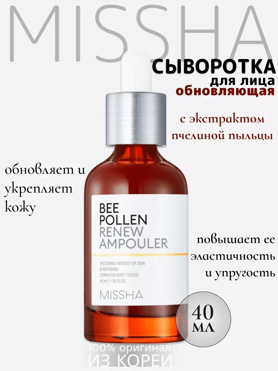 MISSHA Bee Pollen Renew Ampouler renews and strengthens the skin, improving its elasticity and firmness. This serum, based on bee pollen extract, renews and strengthens the skin, improving its elasticity and firmness. It enriches skin cells with moisture and beneficial microelements, giving it a fresher, more youthful appearance. Restores the protective barrier, enhances cellular metabolism and regeneration.