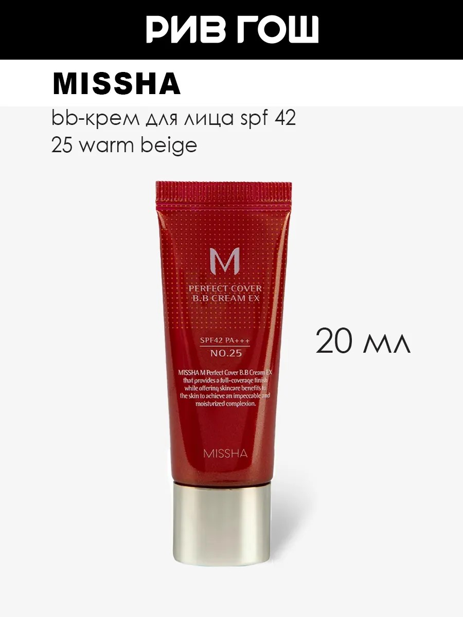 MISSHA M Perfect Cover - идеальное покрытие для вашей кожи: здоровый цвет, свежесть и сияние на весь день! BB-крем это тональный корейский крем для лица, который сочетает в себе функции увлажняющего и защищающего средства. Этот тональный крем для лица BB-крем обладает высокой эффективностью благодаря наличию множества активных ингредиентов, которые помогают улучшить текстуру кожи, сгладить неравномерность пигментации и скрыть видимые дефекты. BB-крем корея популярный корейский продукт, который набирает популярность во всем мире благодаря своим многофункциональным свойствам и легкой текстуре. Этот тональный увлажняющий крем для лица BB-крем помогает увлажнить и защитить кожу от вредных факторов окружающей среды, таких как загрязнения и ультрафиолетовое излучение. M Perfect Cover BB Cream Тональный крем EX SPF 42/PA+++, 20 мл, 25 Warm beige. У нас Вы всегда сможете подобрать женскую и мужскую парфюмерию, декоративную косметику, а так же уходовые средства для волос, тела и лица. РИВ ГОШ вдохновляет дарить подарки каждый день.