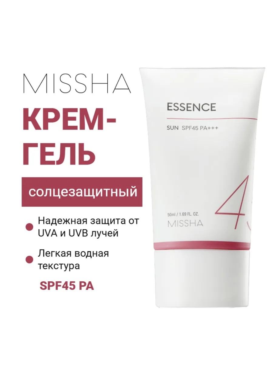 Солнцезащитный крем-гель MISSHA All Around Safe Block Essence Sun SPF45 PA+++ – лёгкое, нежирное кремовое средство для увлажнения и ухода за кожей с высоким фактором защиты от вредного воздействия ультрафиолета UVA- и UBA-лучей. Освежающая текстура санскрина на водной основе легко наносится на кожу и быстро впитывается без эффекта белёсости, полос, липкости и жирности. Крем-гель MISSHA от загара защищает кожу от фотостарения, обезвоженности и потери упругости, преждевременного появления морщин и пигментных пятен, оберегает от солнечных ожогов и заболеваний кожи, связанных с UV-излучением. Подходит в качестве крема-основы под макияж и особенно рекомендован для светлых фототипов кожи . Солнцезащитное средство Missha SPF45 PA+++ в форме лёгкой эссенции не только нейтрализует негативное воздействие ультрафиолета на кожу, но и эффективно ухаживает за ней благодаря увлажняющим компонентам и богатому комплексу растительных экстрактов в составе. Экстракт феронии лимонной (деревянное яблоко) защищает кожу от обжигающих солнечных лучей и сохраняет нежный, ровный цвет лица. Экстракты лотоса и камелии китайской оказывают выраженный омолаживающий эффект и способствуют удержанию влаги в эпидермисе. Экстракт портулака масляничного тонизирует кожу, стимулирует регенерацию тканей, защищает от разрушения кожный коллаген и замедляет процессы старения. Экстракт алое барбаденис прекрасно увлажняет кожу и поддерживает оптимальный уровень влаги в течение длительного времени, заживляет, успокаивает и защищает кожу от неблагоприятных факторов окружающей среды. Пантенол смягчает кожу. А экстракты хризантемы, бессмертника, солодки, корицы и тимьяна усиливают противомикробный, антисептический и противовоспалительный эффекты крема от загара Missha.Регулярное использование санскрина Missha для защиты от солнца обеспечивает ровный цвет кожи без солнечных ожогов и покраснений, подтягивает и оздоровливает эпидермис, эффективно защищает кожу от обезвоживания и фотостарения.
