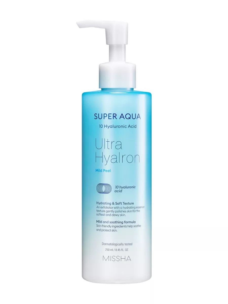 MISSHA Super Aqua Ultra Hyaluronic Mild Peel is a gentle cleanser for delicately removing dead skin cells and impurities. It's an ideal first step in skincare, gentle on the epidermis and enhancing the effectiveness of all subsequent cosmetic procedures. Its gentle cleansing formula, based on natural enzymes and exfoliating synthetic microparticles, promotes delicate exfoliation and gentle removal of dead skin cells.
