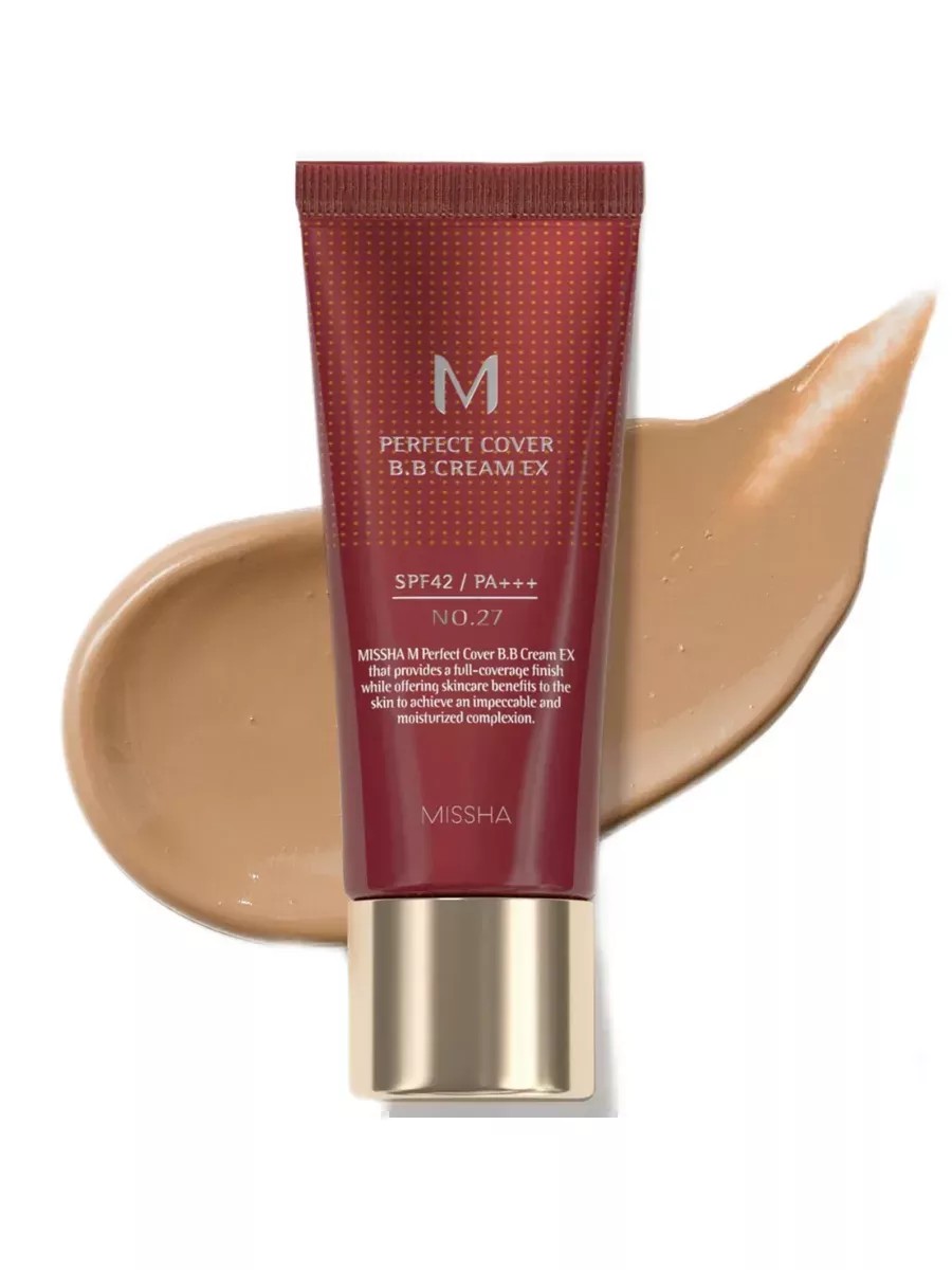 Missha М Perfect Cover BB Cream EX, тональный BB крем Идеальное покрытие, SPF42/PA, тон 27 медовый бежевый, 20 мл. BB-крем создаёт невесомое матовое покрытие без «эффекта маски». Подстраивается под Ваш естественный тон кожи, скрывая несовершенства и заметно улучшая цвет лица. Обеспечивает стойкое покрытие без жирного блеска до 30 часов. Не меняет оттенок в течение дня, не сереет, не темнеет, не скатывается. Благодаря мягкой кремовой текстуре BB крем легко и быстро наносится, равномерно растушёвывается. Идеально перекрывает тёмные круги под глазами, маскирует покраснения и заметно осветляет пигментные пятна. Тональный BB-крем подходит для всех типов кожи, в том числе для чувствительной области вокруг глаз. Эффективно защищает от вредного воздействия солнечных лучей спектра UVA и UVB, фактор защиты SPF 42/PA +++.