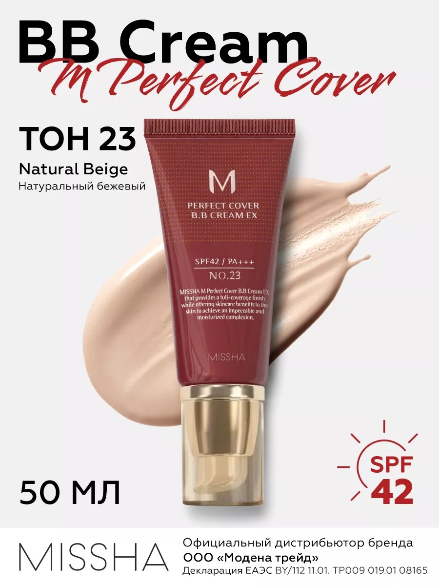 MISSHA M Perfect Cover BB Cream is the best-selling BB cream in the world. Shade 23 has a gray undertone. It perfectly fulfills the three basic functions of BB products (beauty balm) – perfect makeup, innovative skin care, and high sun protection. From the very first day, MISSHA BB Cream has received high praise from professional makeup artists around the world. MISSHA M Perfect Cover BB Cream creates a weightless matte finish without the "mask effect." It adapts to your natural skin tone, concealing imperfections and visibly improving complexion. Provides long-lasting coverage without an oily shine for up to 30 hours. It maintains its color throughout the day, does not gray, darken, or crease. Thanks to its soft, creamy texture, MISSHA M Perfect Cover BB Cream applies quickly and easily, blending evenly. Perfectly covers dark circles under the eyes, conceals redness, and visibly lightens age spots. Hyaluronic acid and ceramides in this BB cream maintain the skin's hydrolipid balance, saturating it with moisture and maintaining comfortable hydration throughout the day. The Gatuline RC botanical complex (beech bud extract) has a pronounced rejuvenating effect: it moisturizes the skin, protects against premature aging, strengthens the epidermis, and reduces the depth of expression lines. Rosemary and chamomile extracts soften the skin, providing a soothing, anti-inflammatory, and antioxidant effect. MISSHA M BB cream is suitable for all skin types, including the sensitive eye area. It effectively protects against the harmful effects of UVA and UVB rays with SPF 42/PA+++. MISSHA M Perfect Cover BB Cream is the perfect coverage for your skin: healthy color, freshness, and radiance all day long! MISSHA is a global beauty brand trusted by over 10 million loyal consumers worldwide.