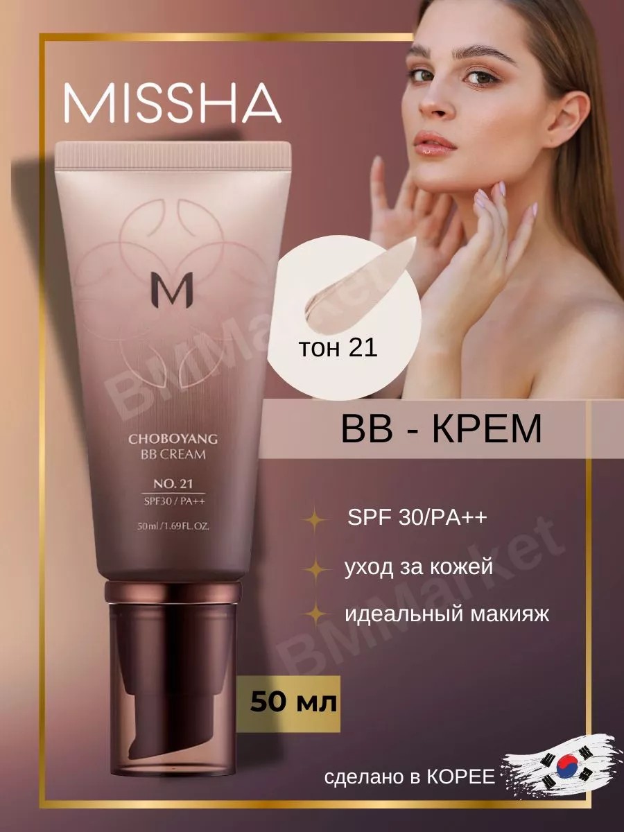 Обновленный BB крем MISSHA M Choboyang BB Cream SPF30/PA++ тон 21 (светло- бежевый) - уникальный многофункциональный продукт для возрастной кожи. Он оказывает омолаживающее действие, увлажняет и нормализует естественный баланс кожи. Обладает противовоспалительными и заживляющими свойствами. BB-крем миша с спф легко наносится и выравнивает тон кожи, скрывает несовершенства, сохраняя стойкость в течение 48 часов. 100% Оригинальная корейская женская косметика. Благодаря своему эффективному составу bb крем корея идеально подходит для зрелой кожи, проблемной, комбинированной и склонной к покраснениям. В составе для защиты кожи содержится экстракт центеллы азиатской, витамин Е разглаживает морщины, золото выравнивает тон кожи, гиалуроновая кислота увлажняет, аденозин стимулирует выработку собственного коллагена в коже, бифида фермент лизат улучшает рельеф и цвет лица, возвращает естественное сияние и гладкость кожи. ББ крем для лица Миша эффективно защищает от вредного воздействия солнечных лучей спектра UVA и UVB, фактор защиты SPF 30/PA ++, способствует сохранению красоты, молодости и здоровья кожи, предотвращает образование пигментации. Для снятия bb крема используйте гидрофильное масло или мицеллярную воду, а затем гель для умывания или молочко. Способ применения: наносится тональник удобным для Вас инструментом: спонжем, кистью или даже пальцами. Небольшое количество средства равномерно распределяется по коже лица. Далее оставьте крем на рекомендованные 5-10 минут, давая ему подстроиться под тон кожи. После этого продолжайте нанесение декоративной косметики.