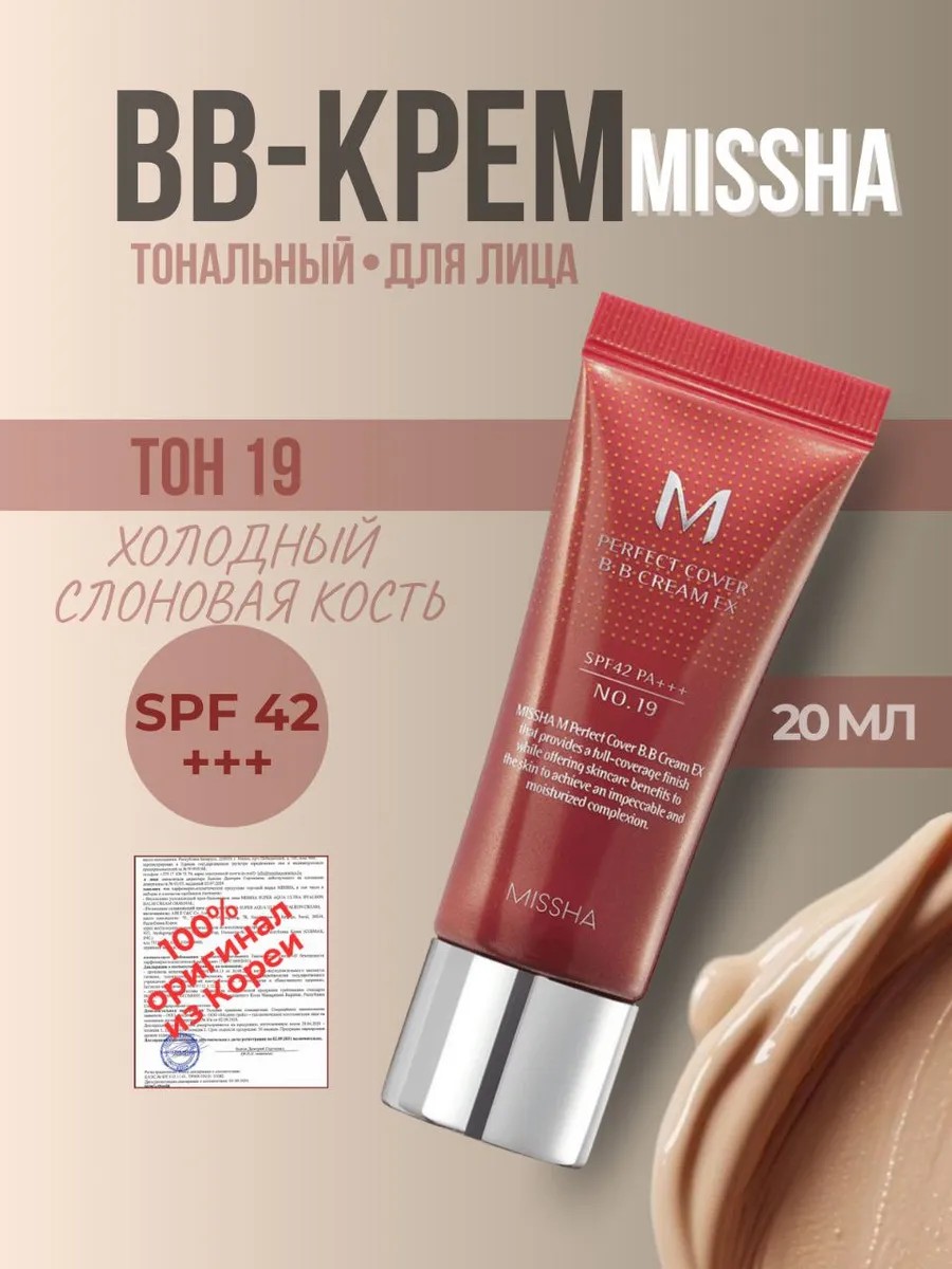 Тональный BB крем MISSHA M Perfect Cover BB Cream EX SPF 42/PA+++ Тон 19, 20 мл — для совершенного макияжа.