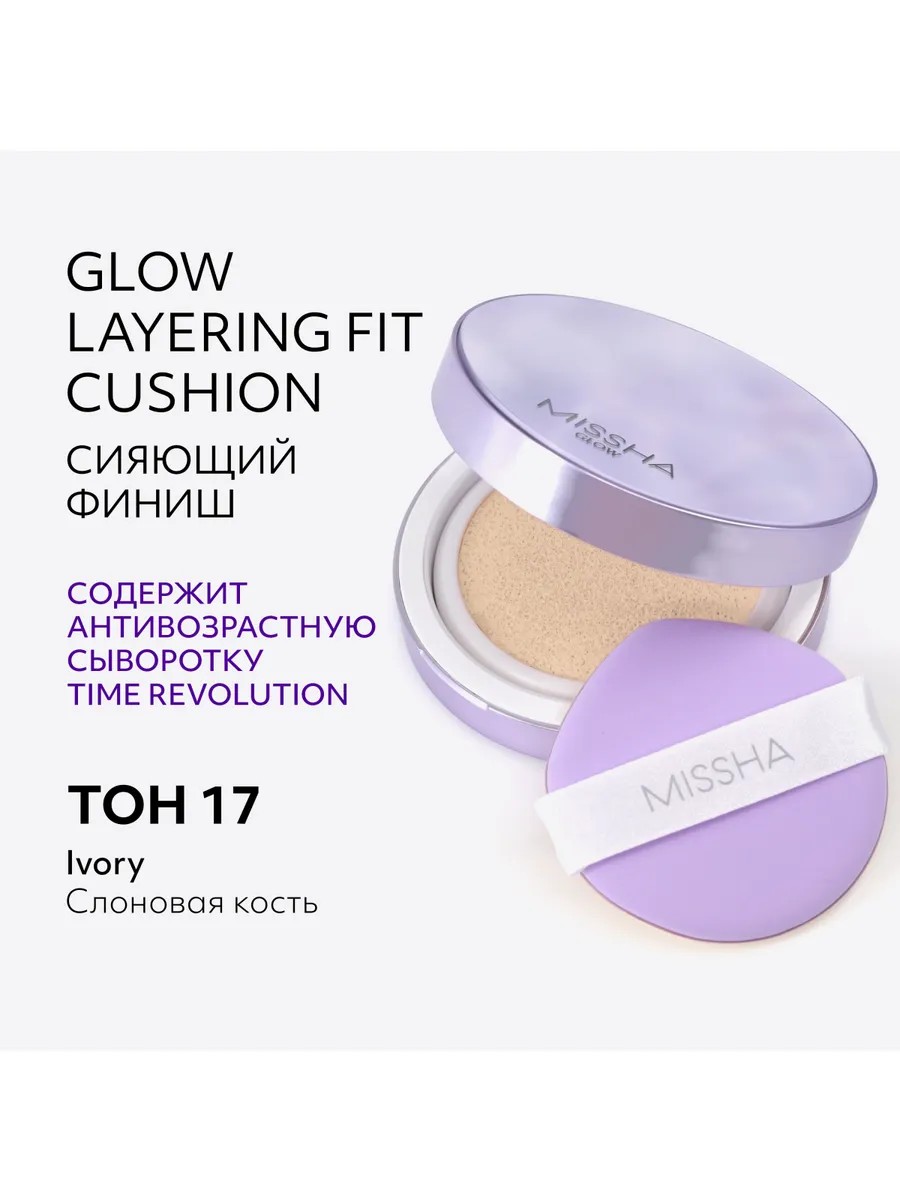 Missha's global breakthrough is now available in Russia! MISSHA Glow Layering Fit Cushion Foundation is a compact, long-lasting foundation that provides 24-hour flawless, even skin tone with a subtle, natural glow. It contains 60% of the highly effective Time Revolution anti-aging facial serum. This new product was developed by renowned Korean beauty experts with meticulous attention to detail, a unique formula, and unparalleled makeup effects. This ultra-fashionable foundation applies evenly and dispenses economically, minimizing dullness and redness, covering dark circles under the eyes, age spots, and acne scars, evens out skin tone, and gives skin a natural, flawless glow. The lightweight coverage feels lightweight, won't dry out skin, won't accentuate flaking, and won't clog pores. Even with repeated applications throughout the day, this cushion foundation resists creasing and settling. Thanks to 10 key ingredients from Time Revolution Night Repair serum with probiotics, MISSHA Glow Layering Fit cushion foundation effectively reduces the signs of aging, improves elasticity, evens out texture, and minimizes the appearance of pores. It's ideal for touching up your makeup throughout the day. The stylish lilac pearlescent case fits easily in even a small purse and is always at hand. The ultra-soft and elastic teardrop-shaped sponge allows for precise and accurate application of foundation to the sides of the nose, the bridge of the nose, and the inner corners of the eyes. Suitable for all skin types, including sensitive, mature, and very dry skin. It protects skin from UV rays with an enhanced SPF of 50 PA++++. Recommended shades for those with yellow undertones are #17 and #21 Fair, while those with pink or red undertones should choose #21 Vanilla and #23 Sand. We recommend removing the protective film from the inner mirror before using the cushion.