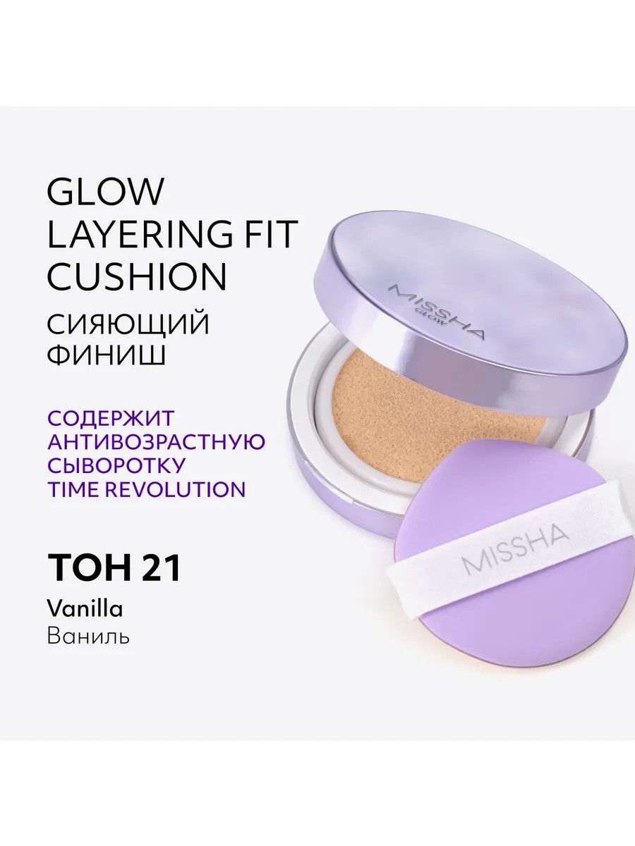 Missha's global breakthrough is now available in Russia! MISSHA Glow Layering Fit Cushion Foundation is a compact, long-lasting foundation that provides 24-hour flawless, even skin tone with a subtle, natural glow. It contains 60% of the highly effective Time Revolution anti-aging facial serum. This new product was developed by renowned Korean beauty experts with meticulous attention to detail, a unique formula, and unparalleled makeup effects. This ultra-fashionable foundation applies evenly and dispenses economically, minimizing dullness and redness, covering dark circles under the eyes, age spots, and acne scars, evens out skin tone, and gives skin a natural, flawless glow. The lightweight coverage feels lightweight, won't dry out skin, won't accentuate flaking, and won't clog pores. Even with repeated applications throughout the day, this cushion foundation resists creasing and settling. Thanks to 10 key ingredients from Time Revolution Night Repair serum with probiotics, MISSHA Glow Layering Fit cushion foundation effectively reduces the signs of aging, improves elasticity, evens out texture, and minimizes the appearance of pores. It's ideal for touching up your makeup throughout the day. The stylish lilac pearlescent case fits easily in even a small purse and is always at hand. The ultra-soft and elastic teardrop-shaped sponge allows for precise and accurate application of foundation to the sides of the nose, the bridge of the nose, and the inner corners of the eyes. Suitable for all skin types, including sensitive, mature, and very dry skin. It protects skin from UV rays with an enhanced SPF of 50 PA++++. Recommended shades for those with yellow undertones are #17 and #21 Fair, while those with pink or red undertones should choose #21 Vanilla and #23 Sand. We recommend removing the protective film from the inner mirror before using the cushion.