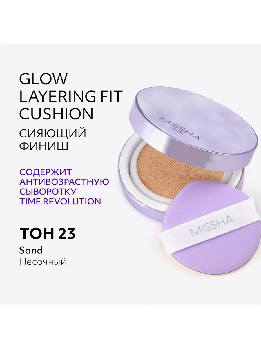 Missha's global breakthrough is now available in Russia! MISSHA Glow Layering Fit Cushion Foundation is a compact, long-lasting foundation that provides 24-hour flawless, even skin tone with a subtle, natural glow. It contains 60% of the highly effective Time Revolution anti-aging facial serum. This new product was developed by renowned Korean beauty experts with meticulous attention to detail, a unique formula, and unparalleled makeup effects. This ultra-fashionable foundation applies evenly and dispenses economically, minimizing dullness and redness, covering dark circles under the eyes, age spots, and acne scars, evens out skin tone, and gives skin a natural, flawless glow. The lightweight coverage feels lightweight, won't dry out skin, won't accentuate flaking, and won't clog pores. Even with repeated applications throughout the day, this cushion foundation resists creasing and settling. Thanks to 10 key ingredients from Time Revolution Night Repair serum with probiotics, MISSHA Glow Layering Fit cushion foundation effectively reduces the signs of aging, improves elasticity, evens out texture, and minimizes the appearance of pores. It's ideal for touching up your makeup throughout the day. The stylish lilac pearlescent case fits easily in even a small purse and is always at hand. The ultra-soft and elastic teardrop-shaped sponge allows for precise and accurate application of foundation to the sides of the nose, the bridge of the nose, and the inner corners of the eyes. Suitable for all skin types, including sensitive, mature, and very dry skin. It protects skin from UV rays with an enhanced SPF of 50 PA++++. Recommended shades for those with yellow undertones are #17 and #21 Fair, while those with pink or red undertones should choose #21 Vanilla and #23 Sand. We recommend removing the protective film from the inner mirror before using the cushion.