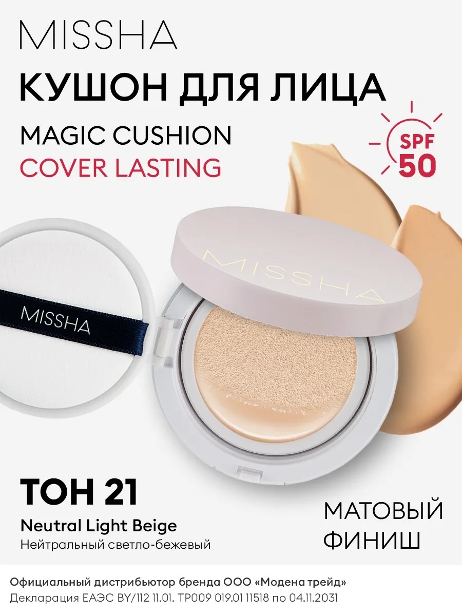 The MISSHA Magic Cushion Cover Lasting foundation creates a semi-matte finish. Suitable for all skin types, especially combination and oily skin. It doesn't run, crease, or fade all day long. Magic Fit Powder, the foundation's base, conceals all skin imperfections. Calendula and peppermint extracts help tighten pores, soothe the skin, and have an anti-inflammatory effect.