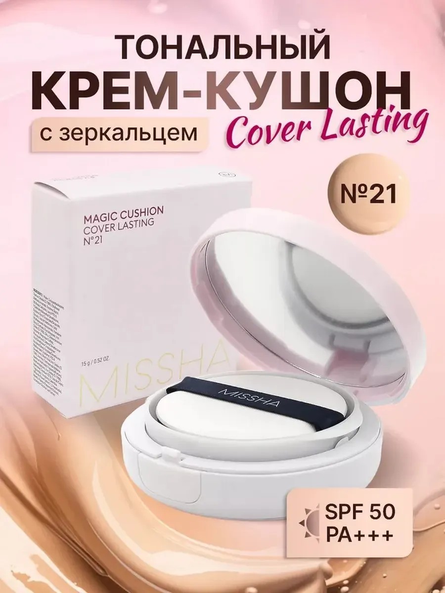 Missha Magic Cushion Cover Lasting SPF50+/PA+++ Тон 21 — это идеальное средство для создания долговременного макияжа с естественным финишем. Этот тональный кушон обеспечивает плотное и стойкое покрытие, скрывая несовершенства и выравнивая тон кожи, особенно для обладателей светлой кожи.