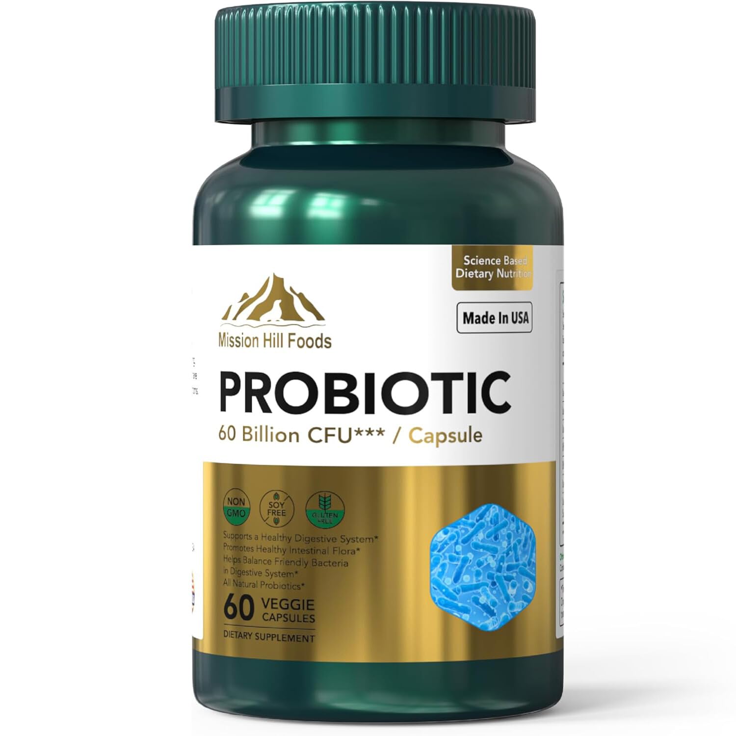 Mission Hill Foods Probiotic 60 Billion CFU with Prebiotics - 7 Strains for Digestive & Gut Health, Immune Support, Shelf Stable, Non-GMO, Gluten & Soy Free, 60 Capsules