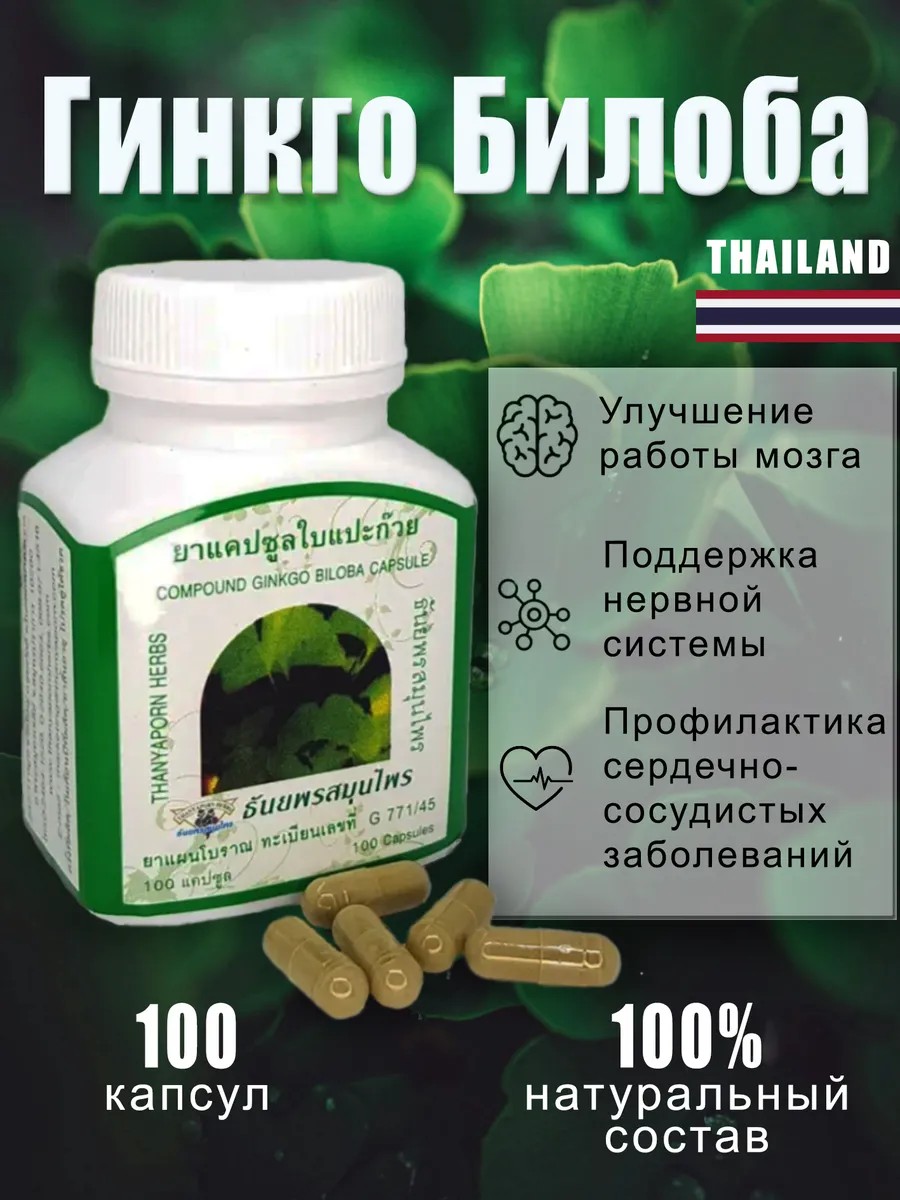 Тайские капсулы Гинкго Билоба — это натуральный способ позаботиться о здоровье вашего мозга и улучшить его функциональность. Капсулы содержат экстракт гинкго билоба, который известен своими уникальными свойствами для поддержания мозговой деятельности. В листьях гинкго билоба содержится много разных антиоксидантов, флавоноидов, терпеноидов и аминокислот благодаря чему это растение является отличным природным стимулятором работы головного мозга, помогает концентрировать внимание, бороться с рассеянностью и забывчивостью. Регулярный прием этих капсул может способствовать улучшению памяти, повышению концентрации внимания и снижению умственной усталости. Гинкго билоба также положительно влияет на нервную систему, помогая ей справляться со стрессом и напряжениями. Тайские лекарства на основе гинкго билоба традиционно используются для улучшения кровообращения в головном мозге, что может быть полезно при мигрени и головных болях. Капсулы имеют полностью натуральный состав без красителей, ароматизаторов и химических добавок, что делает их безопасным и эффективным средством для регулярного применения. Натуральный состав капсул делает их безопасным и эффективным выбором для тех, кто заботится о своем здоровье и стремится сохранить ясность ума на долгие годы.