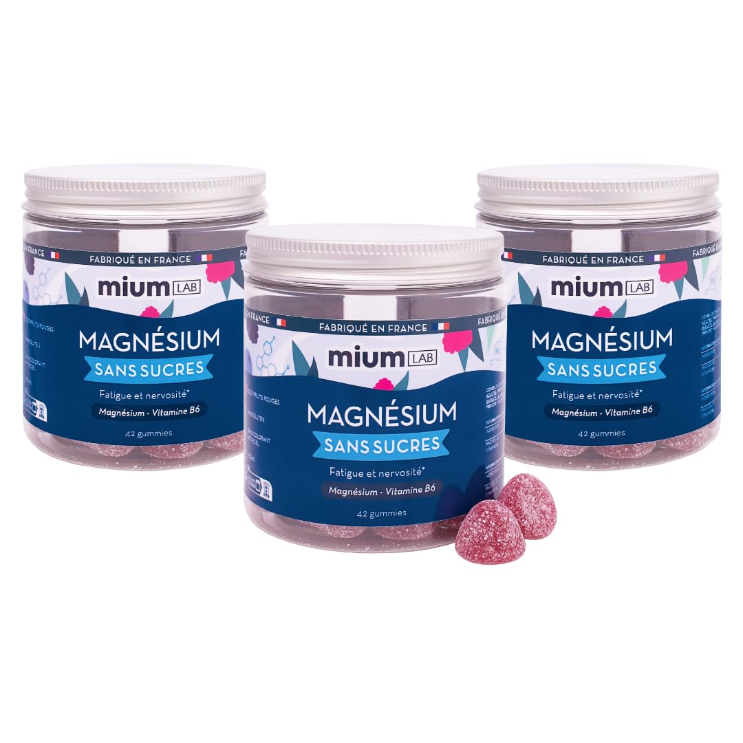 mium LAB - Sugar-Free Magnesium Gummies - 126 gummies - High Dose - High Absorption - Magnesium Citrate Vitamin B6 - Reduces Nervousness and Fatigue - Red Berries - Made in France INGREDIENTS Bulking agent: maltitol - magnesium salts of citric acid - Acidifier: citric acid - Gelling agent: pectin - natural flavoring - concentrate (beetroot and carrot) - pyridoxine hydrochloride (vitamin B6)100 French Manufacturing and Transparency - Our gummies are manufactured in accordance with the strictest quality standards of French regulations. The formulas are registered with the relevant authorities before being placed on the market, and ISO 9001, 22000, and 22716 certifications allow Mium Lab to guarantee its customers optimal quality, meeting their requirements and tailored to their needs. Natural and Plant-Based Formula - Designed to be both natural and suitable for everyone, our gummies are sugar-free, color-free, and preservative-free, making them ideal for vegetarians. Their innovative formula provides a daily intake of 100mg to 300mg of magnesium, the maximum recommended daily intake. ? Energy and Stress Relief - Magnesium is involved in nearly 300 enzymatic reactions. It helps restore vitality in cases of fatigue. It focuses its action on normal energy metabolism, supporting the nervous system, including concentration issues, and muscle function. Magnesium is very beneficial for athletes due to its impact on protein synthesis and muscle recovery. High Bioavailability and Advanced Formulation - Many forms of magnesium exist, but they are not all created equal. We have chosen Magnesium Citrate, a mineral salt that binds magnesium to citric acid. In this form, magnesium has excellent bioavailability, and its combination with citric acid allows it to act as an acidity regulator, helping to maintain the acid-base balance of our body. The ideal gummie form for absorption - Our Mium Lab Magnesium gummies revolutionize magnesium supplementation by combining a high concentration with optimal absorption. Thanks to the innovative use of magnesium citrate, vitamin B6 and fruit pectin, our gummies guarantee superior bioavailability without disrupting digestive comfort, a challenge often encountered with other forms of magnesium.mium LAB - Gummies Magnésium sans sucre - 126 gummies - Hautement dosé - Haute absorption - Citrate de Magnésium Vitamine B6 - Réduit nervosité et fatigue - Fruits rouges - Fabriqué en France 1 unité (Lot de 3)DESCRIPTION DU PRODUIT DESCRIPTION DU PRODUIT mium LAB - Gummies Magnésium sans sucre - 126 gummies - Hautement dosé - Haute absorption - Citrate de Magnésium Vitamine B6 - Réduit nervosité et fatigue - Fruits rouges - Fabriqué en France INGRÉDIENTS Agent de charge : maltitol - sels de magnésium de l'acide citrique - Acidifiant : acide citrique - Gélifiant : pectine - arôme naturel - concentré (betterave rouge et carotte) - chlorhydrate de pyridoxine (vitamine B6)Fabrication 100 française et Transparence - Nos gummies sont fabriqués en respectant les normes de qualité les plus strictes de la règlementation française. Les formules font l'objet de dépôt auprès des autorités avant mise sur le marché et les certifications ISO 9001, 22000 et 22716 permettent à Mium Lab de garantir à ses clients une qualité optimale, à la hauteur de leurs exigences et adaptée à leurs besoins. Formule Naturelle et Végétale - Conçus pour être à la fois naturels et adaptés à tous, nos gummies sont sans sucres, sans colorants ou conservateurs, et conviennent parfaitement aux végétariens. Leur formule innovante permet un apport quotidien de 100mg à 300mg jour de magnésium, soit l'apport maximal autorisé. ? Énergie et Anti-Stress - Le magnésium intervient dans près de 300 réactions enzymatiques. ll participe au rétablissement de la vitalité en cas de fatigue. Il concentre son action sur le métabolisme énergétique normal, soutient le système nerveux dont les problèmes de concentration et la fonction musculaire. Le magnesium est très utile pour les sportifs en raison de son impact sur la synthèse des protéines et la récupération musculaire. Haute Biodisponibilité et Formulation Avancée - De nombreuses formes de magnésium existent en ne se valent pas. Nous avons choisi le Citrate de Magnésium, un sel minéral qui lie le magnésium à de l'acide citrique. Sous cette forme, le magnésium a une très bonne biodisponibilité et son association avec l'acide citrique lui permet de jouer un rôle de régulateur d'acidité et aide à maintenir l'équilibre acido-basique de notre organisme. La forme Gomme idéale pour l'absorption - Nos gummies Magnésium Mium Lab révolutionnent la supplémentation en magnésium en alliant une teneur élevée et une absorption optimale. Grâce à l'utilisation innovante du citrate de magnésium, de la vitamine B6 et de la pectine de fruit, nos gummies garantissent une biodisponibilité supérieure sans perturber le confort digestif, un défi souvent rencontré avec d'autres formes de magnésium.