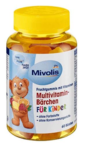 DESCRIPTION DU PRODUIT Les oursons multivitaminés Mivolis pour enfants avec des vitamines sont exempts de colorants ni d'œufs ni de soja et sans conservateurs. Les ours multivitaminés contiennent des vitamines B1, B2, B6, B12, C et E, acide pantothénique, biotine et niacine.