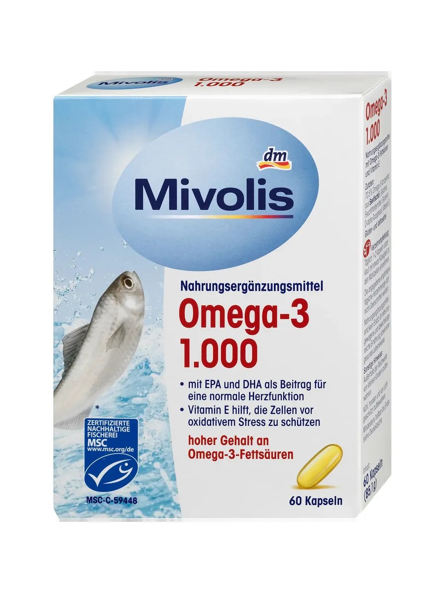 Миволис Омега-3 1000 содержит жир морской рыбы, который богат ненасыщенными жирными кислотами омега-3, особенно двумя жирными кислотами - ЭПК (эйкозапентаеновая кислота) и ДГК (докозагексаеновая кислота). Они выполняют множество функций в организме человека, например, для сердца. При ежедневном приеме 250 мг ЭПК и ДГК они способствуют нормальной работе сердца. Морская рыба богата ЭПК и ДГК, поэтому нам следует употреблять ее регулярно. В качестве альтернативы, Mivolis Omega-3 1000 помогает обеспечить поступление этих жирных кислот. Миволис Омега-3- 1000 уже содержит не менее 260 мг жирных кислот в каждой капсуле, а также витамин Е. Это помогает защитить клетки от окислительного стресса.
