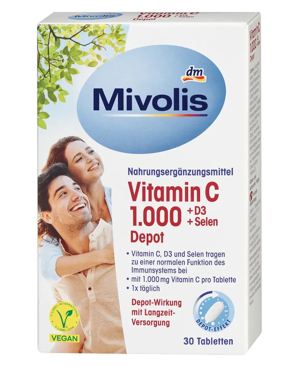 Витамин С 1000 + D3 + Селен Депо Миволи содержит витамин С, витамин D3 и селен, которые обеспечивают организм питательными веществами для иммунной системы в течение всего года. Витамин С, витамин D и селен способствуют нормальному функционированию иммунной системы. Витамин С необходим нашему организму для выполнения широкого спектра задач. Он помогает снизить утомляемость и утомляемость, а также способствует нормальному энергетическому обмену. Витамин D3, также называемый "солнечным витамином", организм может вырабатывать самостоятельно только в том случае, если на кожу попадает достаточное количество солнечных лучей. Особенно в темные зимние месяцы или когда вы слишком мало проводите время на открытом воздухе, собственного производства может быть недостаточно, и добавки могут оказаться полезными. В отличие от витамина D3, организм не может самостоятельно вырабатывать микроэлемент селен, поэтому его получение необходимо с пищей. Как и витамин С, он помогает защитить клетки от окислительного стресса. Технология депо обеспечивает отложенное высвобождение ингредиентов и, следовательно, обеспечивает более длительный запас витамина С, витамина D3 и селена.