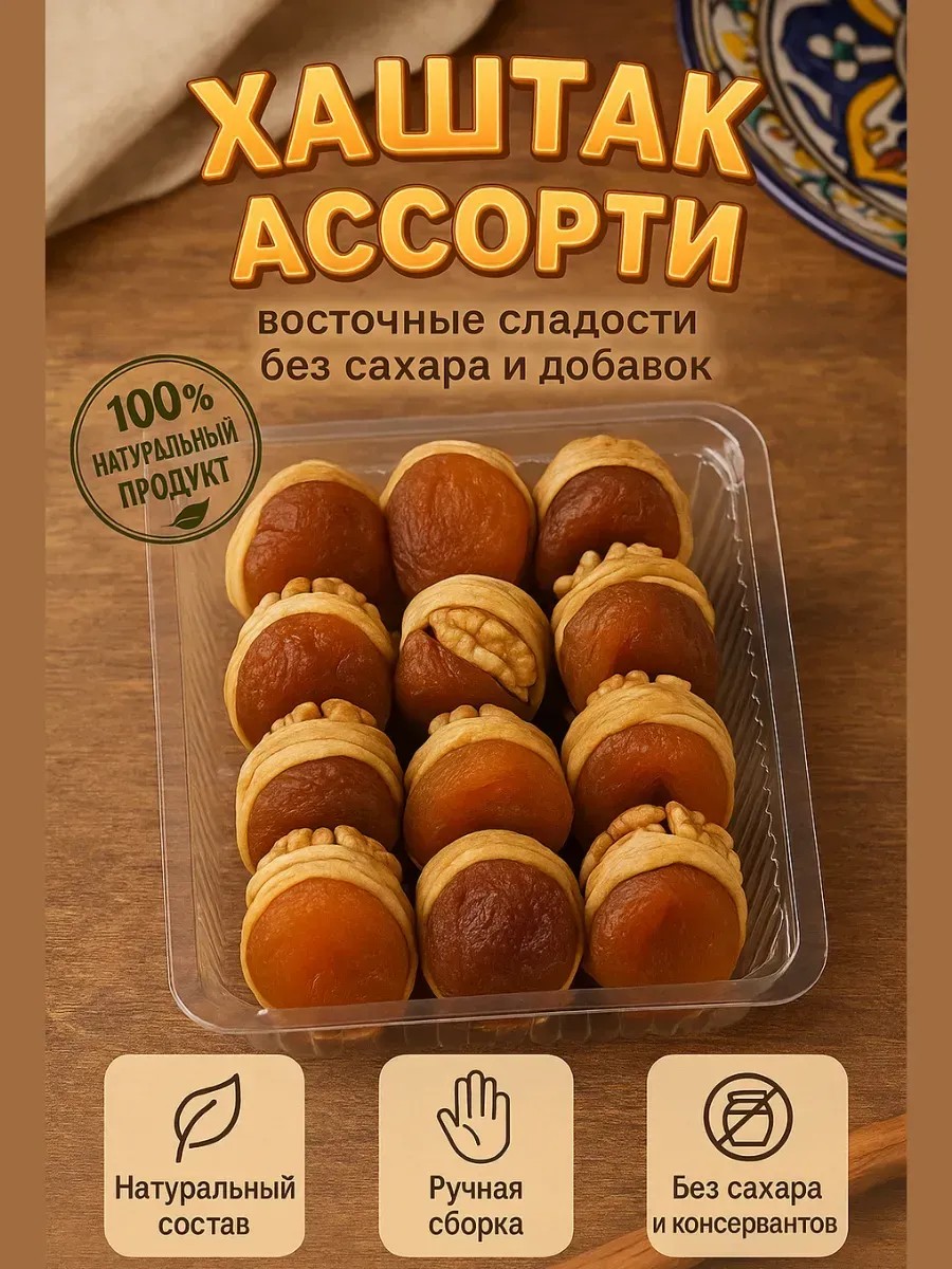 Каждое изделие бережно завернуто вручную — хаштак красиво смотрится и на праздничном столе, и как натуральный подарок. Упаковка 500 г удобна для хранения, транспортировки и использования дома, в офисе или в поездке. Продукт долго хранится (до 8 месяцев), не теряя вкуса и пользы. Хаштак часто выбирают как ассорти сухофруктов с орехами, сухофрукты без сахара натуральные, восточные сладости ручной работы или полезные сладости к чаю.