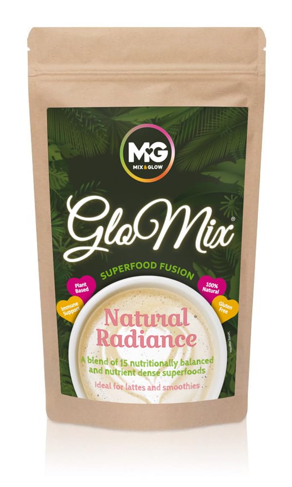GREAT TASTE Mix a tablespoon into your favorite drink or smoothie. Perfect for breakfast or an afternoon lift, Glo Mix integrates seamlessly into your routine for a quick and convenient nutritional boost. Drink to life!. UNPARALLELED QUALITY Glo Mix is distinguished by its nutrient-dense profile. Ethically sourced sustainable ingredients and eco packaging bring the best of nature into every scoop. We value contributing to a healthier planet. IMMUNITY BOOST Our prebiotic formulas aid digestion and intestinal health. Fortified with Turmeric, Ginger, Cocoa and MCT Oil for increased energy and collagen formation, to strengthen your immune system and vitality to flourish. ADVANCED NUTRITION Abundant with plant-based, bioavailable vitamins and minerals to boost energy, improve digestion and improve mental focus. Our expert blends work in harmony as a comprehensive well-being support. HEALTHY BY NATURAL Effortlessly boost your daily nutrition with a premium blend of 15 advanced herbs, vegetables, antioxidants and adaptogens. Designed to support immune health and naturally nourish the body and mind.Mix Glow - Vegan Superfood poeder, prebiotische mix van 15 geavanceerde kruiden, groenten en adaptogenen, inclusief kurkuma, gember, cacao en MCT olie voor hersenbrandstof, glutenvrij, (30 porties).GEWELDIGE SMAAK Meng een eetlepel in je favoriete drankje of smoothie. Perfect voor ontbijt of een middaglift, Glo Mix integreert naadloos in uw routine voor een snelle en handige voedingsboost. Drink tot leven!. ONGEËVENAARDE KWALITEIT Glo Mix onderscheidt zich door zijn nutriëntendichte profiel. Ethisch geproduceerde duurzame ingrediënten en eco-verpakkingen zorgen voor het beste van de natuur in elke primeur. Wij hechten waarde aan een bijdrage aan een gezondere planeet. IMMUNITY BOOST Onze prebiotische formules helpen de spijsvertering en de darmgezondheid. Versterkt met kurkuma, gember, cacao en MCT olie voor meer energie en collageenvorming, om je immuunsysteem te versterken en vitaliteit te bloeien. GEAVANCEERDE VOEDING Overvloedig met plantaardige, biologisch beschikbare vitamines en mineralen om energie te stimuleren, de spijsvertering te verbeteren en de mentale focus te verbeteren. Onze deskundige mengsels werken in harmonie als een uitgebreide welzijnsondersteuning. GEZOND VAN NATUUR Verhoog uw dagelijkse voeding moeiteloos met een premium mix van 15 geavanceerde kruiden, groenten, antioxidanten en adaptogenen. Ontworpen om de gezondheid van het immuunsysteem te ondersteunen en lichaam en geest op natuurlijke wijze te voeden.