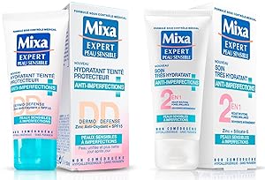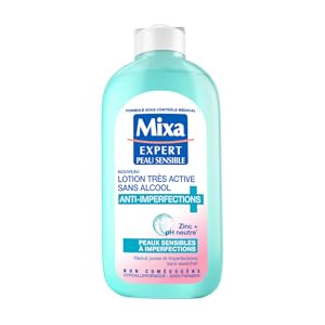 The 1st highly active alcohol-free anti-blemish mixa lotion that reduces poresNon-comedogenic - Hypoallergenic - Paraben-free. Skin is perfectly clear, immediately. Enriched with Purifying Zinc, an anti-blemish active ingredient, this lotion tightens pores, mattifies and reduces spots day after day. Alcohol-free and pH neutral (for the skin), it gently removes the last impurities and traces of makeup, without attacking or drying out. The 1st Mixa Very Active Alcohol-Free Anti-blemish Lotion that reduces pores and spots without drying out. La 1ère lotion très active sans alcool anti-imperfections mixa qui réduit poresNon comédogène - Hypoallergénique - Sans Paraben. La peau est parfaitement nette, immédiatement. Enrichie en Zinc Purifiant, actif anti-imperfections, cette lotion resserre les pores, matifie et réduit jour après jour les boutons. Sans alcool et au pH Neutre (pour la peau), elle élimine en douceur les dernières impuretés et traces de maquillage, sans agresser ni dessécher. La 1ère Lotion Très Active Sans Alcool Anti-imperfections Mixa qui réduit pores et boutons sans assécher.