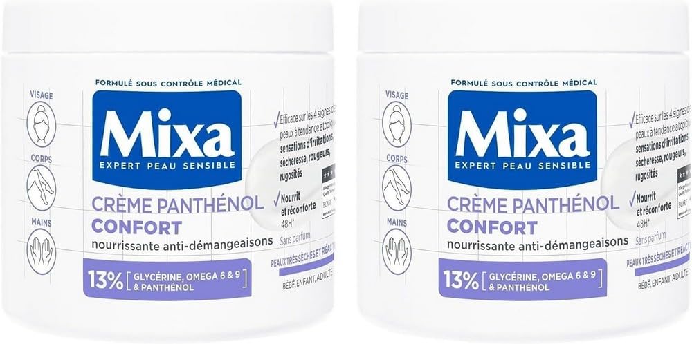 Very dry and reactive skin requires highly concentrated moisturizing and soothing care that respects their sensitivity: our nourishing and anti-itching cream is hypoallergenic, non-greasy, non-sticky and is immediately absorbed. Day after day, women report more pleasant skin (90 ) , less pulling (84 ) and itching (80 ) . Formulated with powerful dermo-cosmetic active ingredients and is suitable for sensitive skin. Panthenol: known for its soothing properties. GLYCERIN: known for its intensive moisturizing and protective properties. Omega 6 9: known for its smoothing properties. Tested under medical supervision. Clinically proven results tested on 100 sensitive skin. Consumer test after 4 weeks of use on 71 women , 53 women and 36 women . Tests on the list of Mixa products on mixa.fr. INGREDIENTS Aqua Water • Glycerin • Butyrospermum Park Butter Shea Butter • ISOPROPYL PALMITATE • PROPANEDIOL • CETYL ALCOHOL • MYRISTATE • PANTHENOL • ZEA MAYS STARCH Horn Starch. Niacinamide Capryll Glycol Carbomer Citric Aid • Hydroxyacetophenone • Polyglyceryl-3 methyl glucose distearate • Sodium hydroxide • TOCOPHEROL INSTRUCTIONS FOR USE Apply to the body at any time of the day. SAFETY WARNING The lists of ingredients in the composition of our brand products are regularly updated. Before using any product from our brand, read the ingredients list on the packaging to ensure that the ingredients are suitable for personal use See moreContents: 2 x Panthenol comfort cream, 400 ml consumer test Tests on the list of Mixa products on mixa.fr. MIXA Guarantee: tested under medical supervision. Clinically proven results, hypoallergenic formula. Tested on 7000 sensitive skin . Active ingredients: formulated with powerful dermo-cosmetic active ingredients and suitable for sensitive skin. Panthenol with soothing properties. Glycerin with moisturizing and protective properties. Omega 6 and 9, known for their smoothing properties. Benefits: Effective on all 4 signs of atopic skin (skin irritations, dryness, redness, roughness). Nourishes and soothes for 48 hours . Hypoallergenic, non-greasy, non-sticky and absorbed immediately. Panthenol Comfort Cream: anti-itch for very dry and reactive skin. face, body, hands. baby, child, adults.Mixa Intensieve droge huid, crème panthenol comfort, tegen jeuk, zeer droge en reactieve huid, gezicht, lichaam, handen, baby, kinderen, volwassenen, hypoallergeen, parfumvrij, 400 ml Zeer droge en reactieve huid vereist sterk geconcentreerde vochtinbrengende en kalmerende verzorging die hun gevoeligheid respecteert: onze voedende en jeukende crème is hypoallergeen, niet vettig, niet plakkerig en trekt onmiddellijk in. Dag na dag melden vrouwen een aangenamere huid (90 ) , minder trekken (84 ) en jeuk (80 ) . Geformuleerd met krachtige dermo-cosmetische werkzame stoffen en is geschikt voor de gevoelige huid. Panthenol: bekend om zijn rustgevende eigenschappen. GLYCERIN: bekend om zijn intensieve hydraterende en beschermende eigenschappen. Omega 6 9: bekend om zijn gladmakende eigenschappen. Getest onder medisch toezicht. Klinisch bewezen resultaten getest op 100 gevoelige huid. Consumententest na 4 weken gebruik bij 71 vrouwen , 53 vrouwen en 36 vrouwen . Tests op de lijst van Mixa producten op mixa.fr. INGREDIËNTEN Aqua Water • Glycerine • Butyrospermum Park Boter Shea Boter • ISOPROPYL PALMITAAT • PROPANEDIOL • CETYL ALCOHOL • MYRISTATE • PANTHENOL • ZEA MAYS STARCH Hoorn Starch. Niacinamide Capryll Glycol Carbomeer Citric Aid • Hydroxyacetofenon • Polyglyceryl-3 methylglucosedistearaat • Natriumhydroxide • TOCOPHEROL GEBRUIKSAANWIJZING Op elk moment van de dag op het lichaam aanbrengen. VEILIGHEIDSWAARSCHUWING De lijsten met ingrediënten in de samenstelling van onze merkproducten worden regelmatig bijgewerkt. Lees voordat je een product van ons merk gebruikt de ingrediëntenlijst op de verpakking om ervoor te zorgen dat de ingrediënten geschikt zijn voor persoonlijk gebruik Meer bekijkenInhoud: 2 x Panthenol comfort-crème, 400 ml consumententest Tests op de lijst van Mixa producten op mixa.fr. MIXA Garantie: getest onder medisch toezicht. Klinisch bewezen resultaten, hypoallergene formule. Getest op 7000 gevoelige huid . Werkzame stoffen: geformuleerd met krachtige dermo-cosmetica werkzame stoffen en geschikt voor de gevoelige huid. Panthenol met rustgevende eigenschappen. Glycerine met hydraterende en beschermende eigenschappen. Omega 6 en 9, bekend om hun gladmakende eigenschappen. Voordelen: effectief bij alle 4 tekenen van atopische huid (huidirritaties, droogheid, roodheid, ruwheid). Voedt en kalmeert 48 uur . Hypoallergeen, niet vettig, niet plakkerig en trekt onmiddellijk in. Panthenol Comfort Crème: anti-jeuk voor een zeer droge en reactieve huid. gezicht, lichaam, handen. baby, kind, volwassenen.